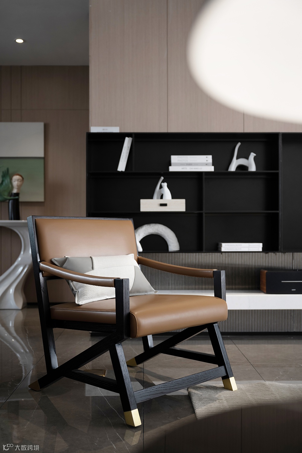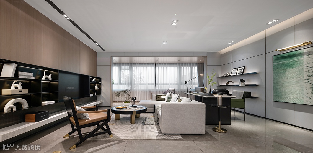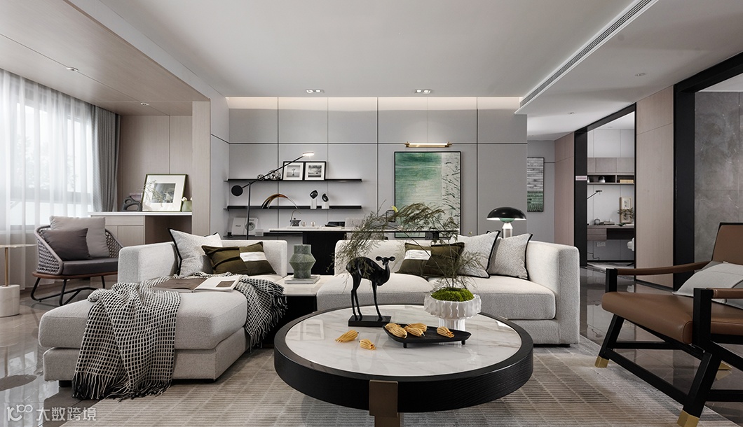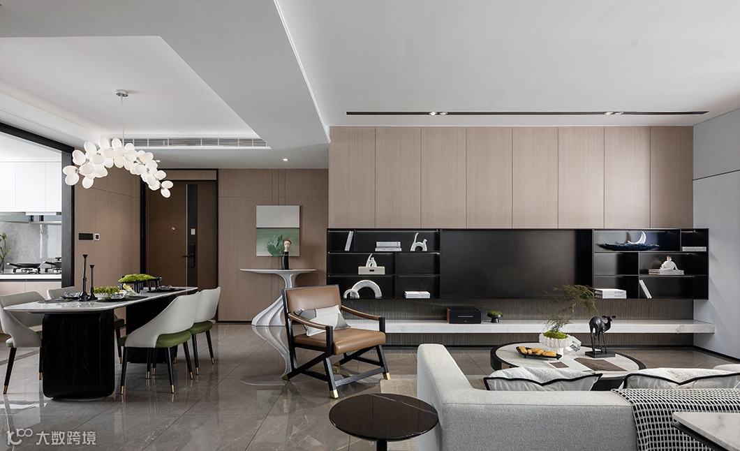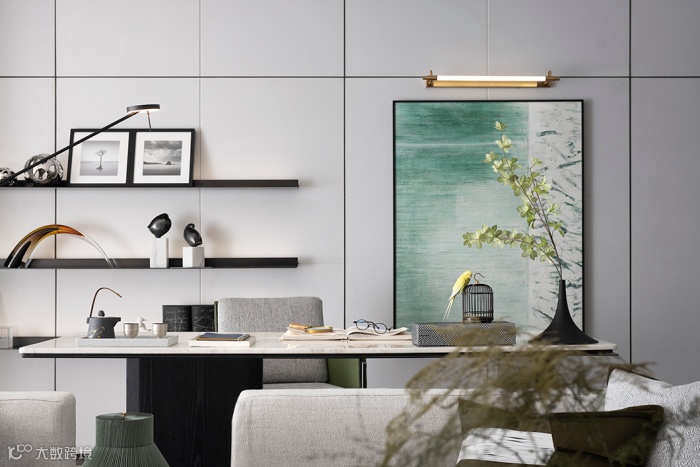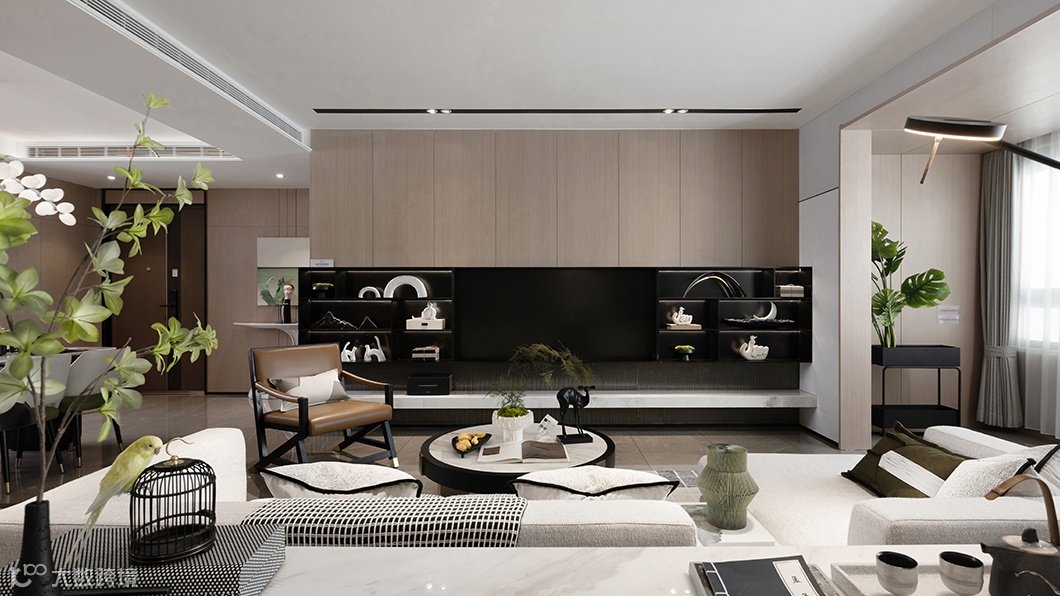 客厅设计表现上回归本真,以墨入画,用雅逸洒脱的水墨画品、自然飞鸟等元素为主线,将古今中外文化融汇出新,营构一宅现代东方人文居所。