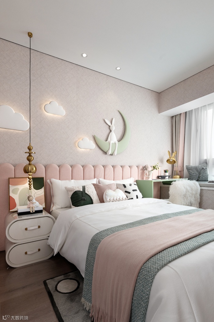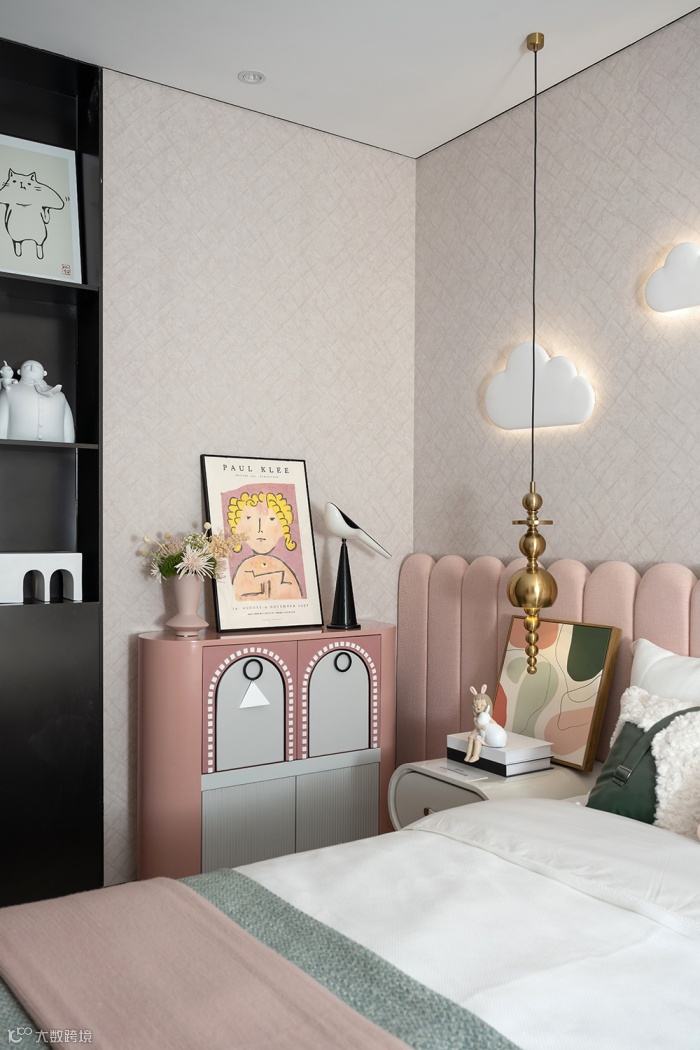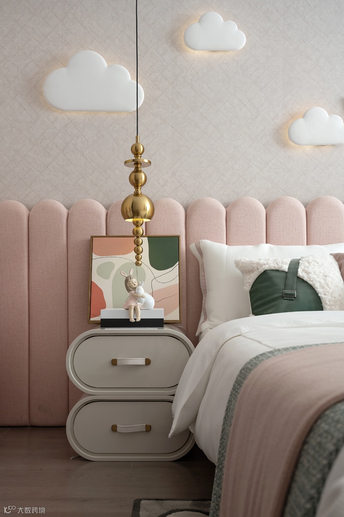淡粉色的宽背床把空间整合的分外整洁利落,朵朵云彩的灯光画品用柔和的投影包裹着孩子的梦想。