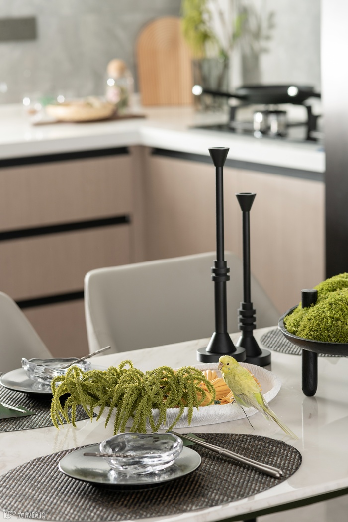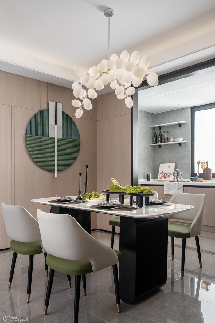 晶莹的餐厅吊灯好似果实累累般自然下垂,餐台上的苔藓盆景中站立着嬉戏其间的小鹦鹉,充分体现盐城湿地滩涂的自然生机,在艺术氛围中糅入生活的纯净气息,让居者感受饮食时光的美好温度。