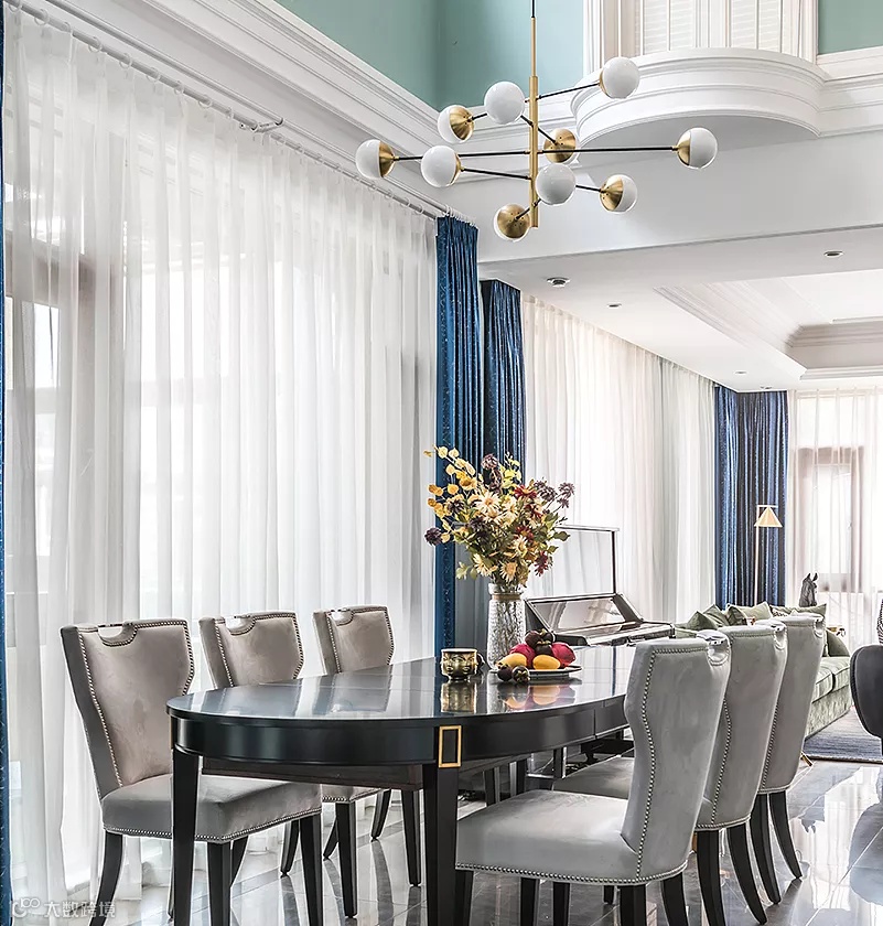富有韵味的深绿绒面沙发,与空间中的金属元素加以调和,在造型灯具的衬托下,让整个空间充满了时尚感,具有极致的奢华魅力。