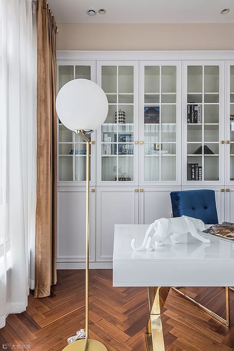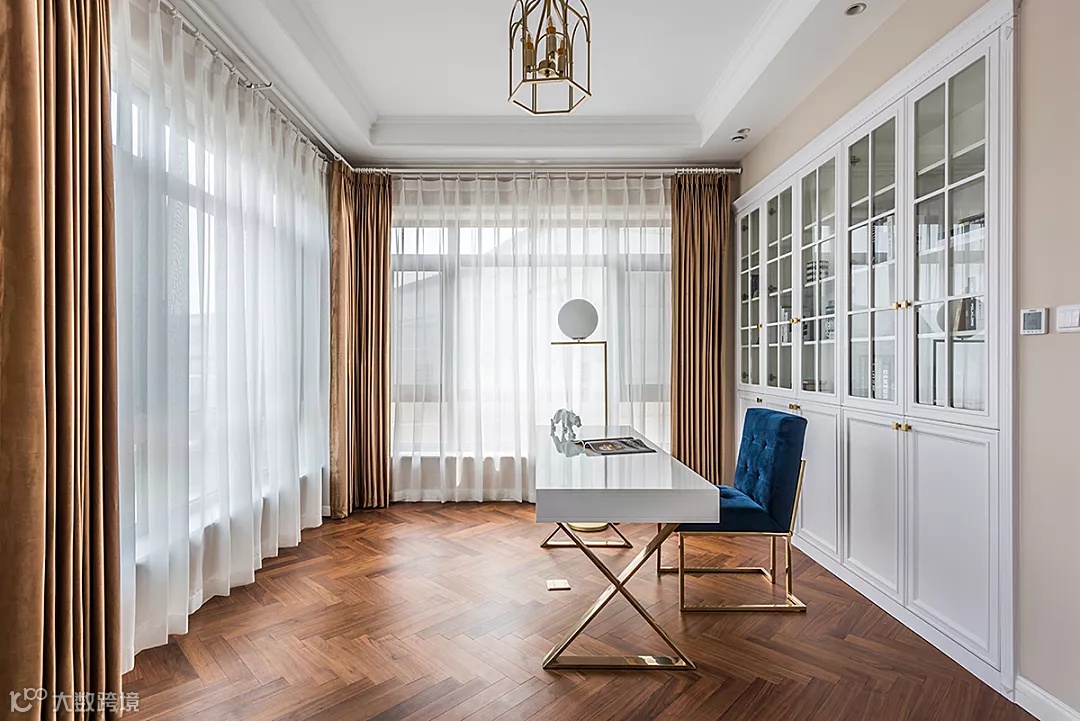 极具摩登风情的极简书桌就让工作空间充满活力,层次感系统柜作背景书架,金色吊灯及金色窗帘呈现时尚轻奢空间。