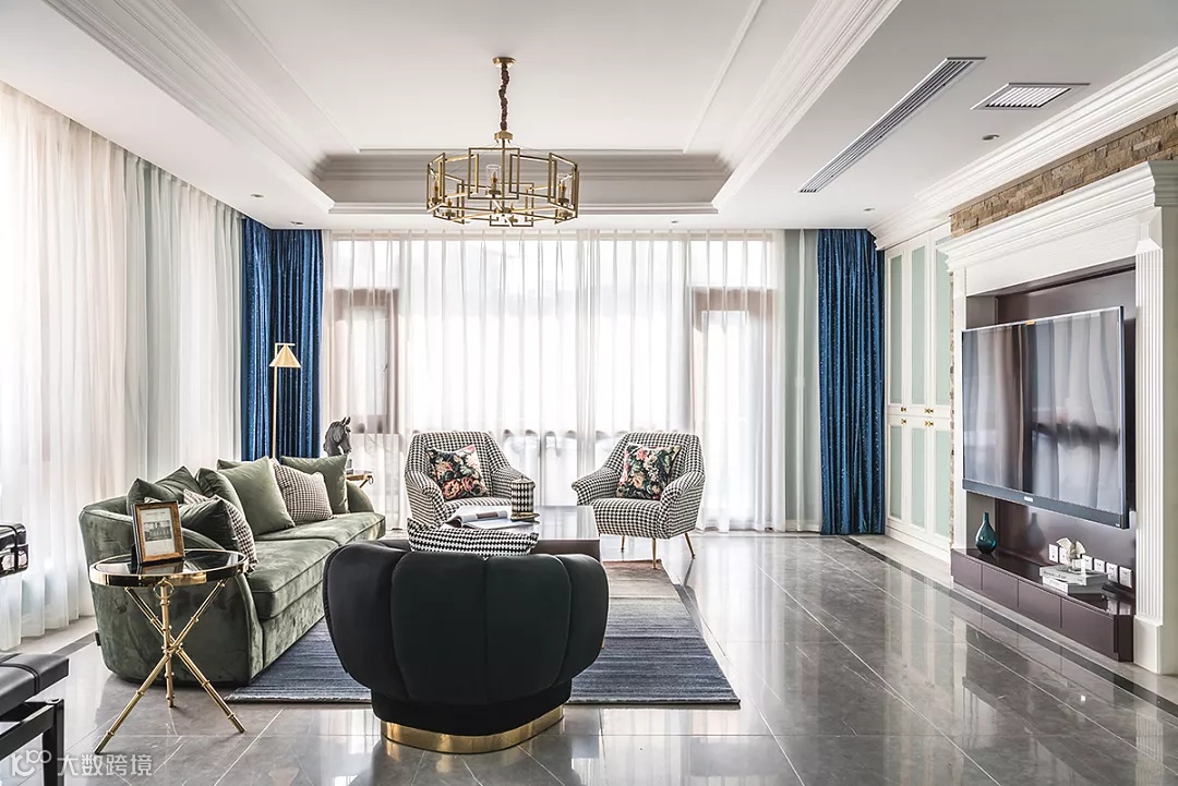 沙发和窗帘的绒面质感散发着温馨的味道,超大的落地窗搭配白色纱帘,清新自然,又中和了空间中的亮色。