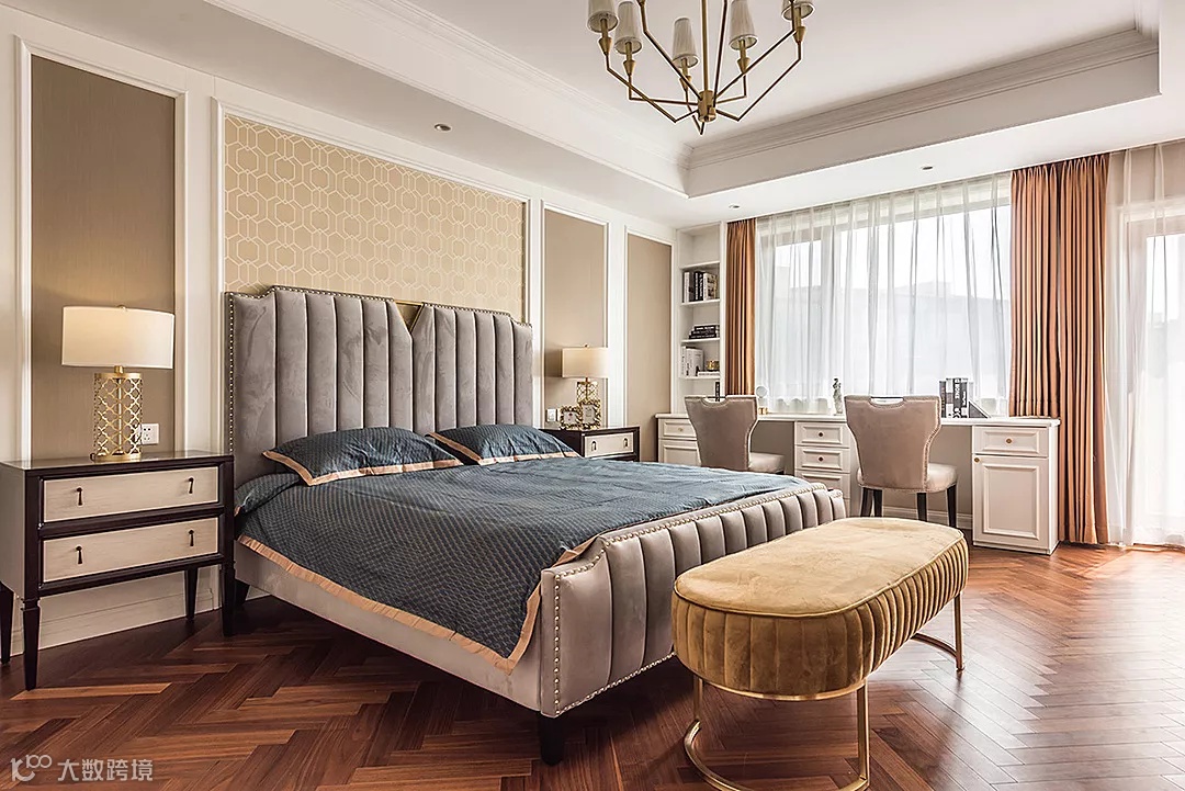 人字形的原木地板搭配金属质感的欧式家具,端庄典雅,分外精致。金属材质的落地灯,为空间注入了轻奢的气息,随时随地感受生活的质感。