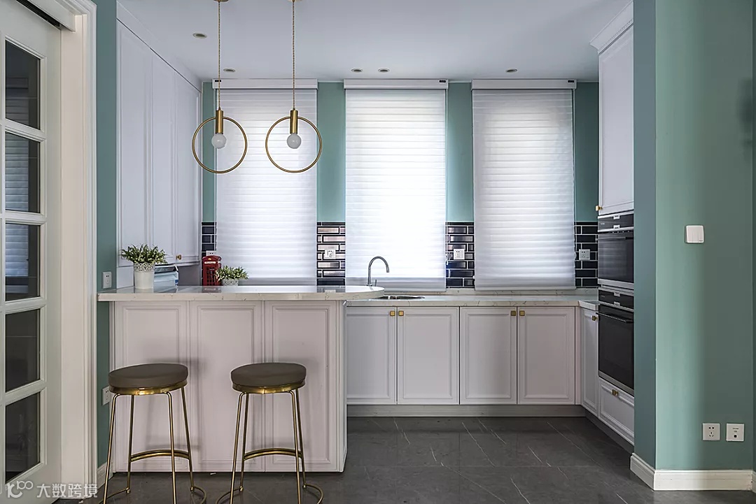 开放式的厨房与简约的餐厅吧台设计,能够体现房间主人对生活品质的追求。白色大理石的拐角吧台,加上柜门上的金属装饰,颇具线条感的金色圆形吊灯,使得空间更显灵动感。