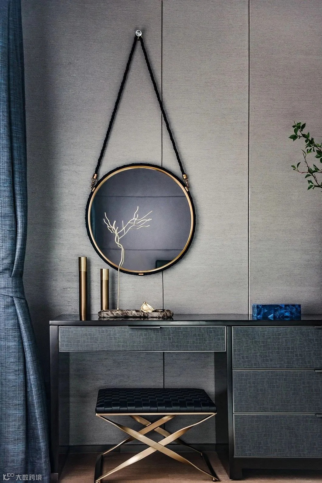 圆形的镜子是点睛之笔,不但有扩张视觉的效果,搭以不同材质与肌理的配饰,尽展低调雅奢之风华。