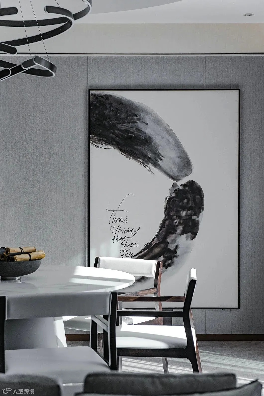 一旁的巨框水墨画作突出东方笔触,颇显意境,自然的材质,让整个空间显得空灵清隽。