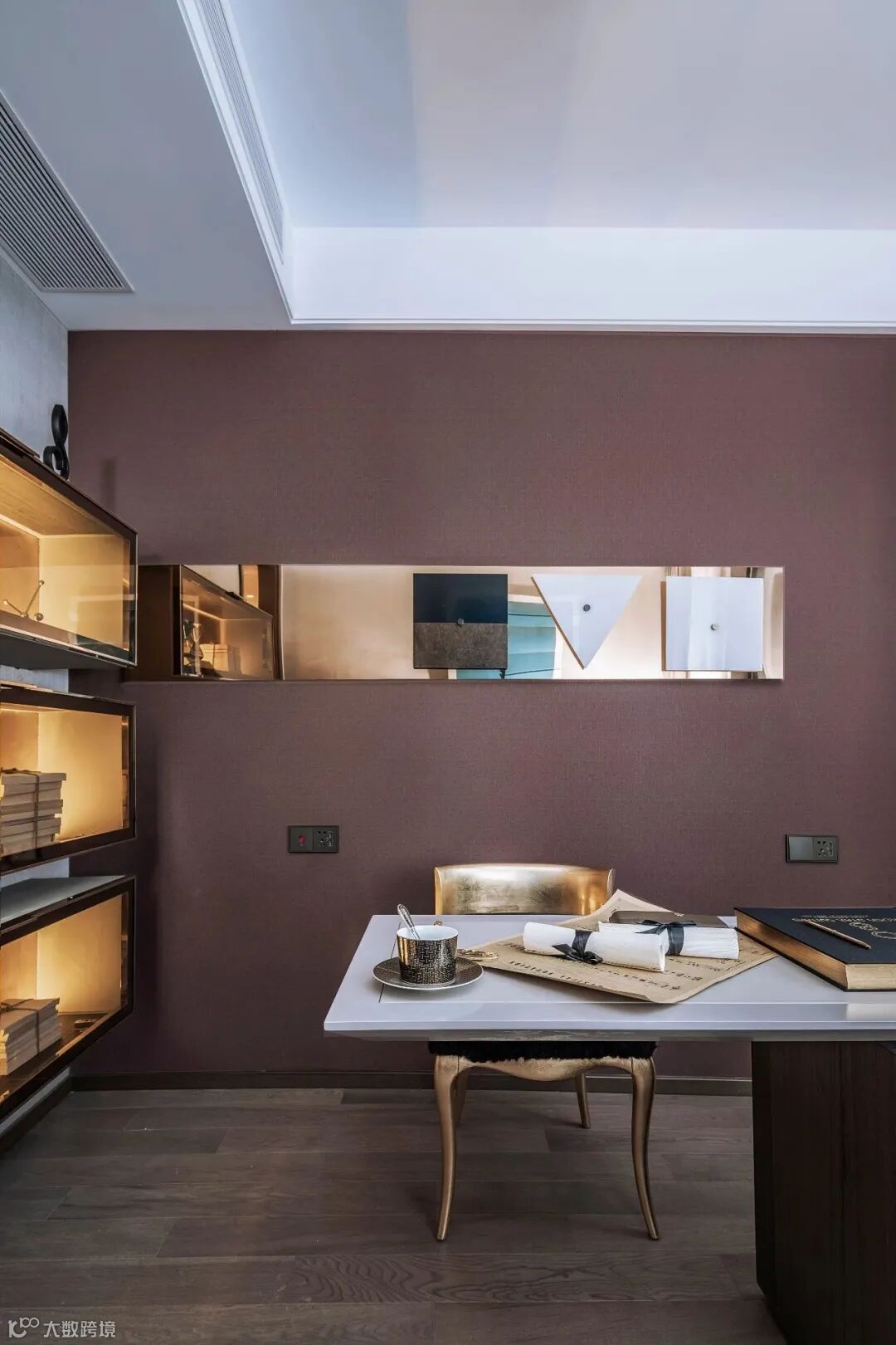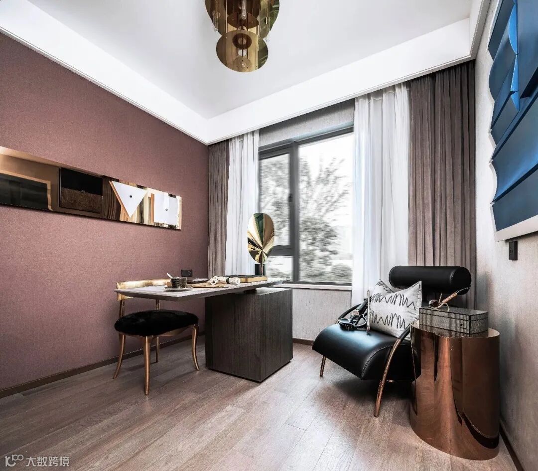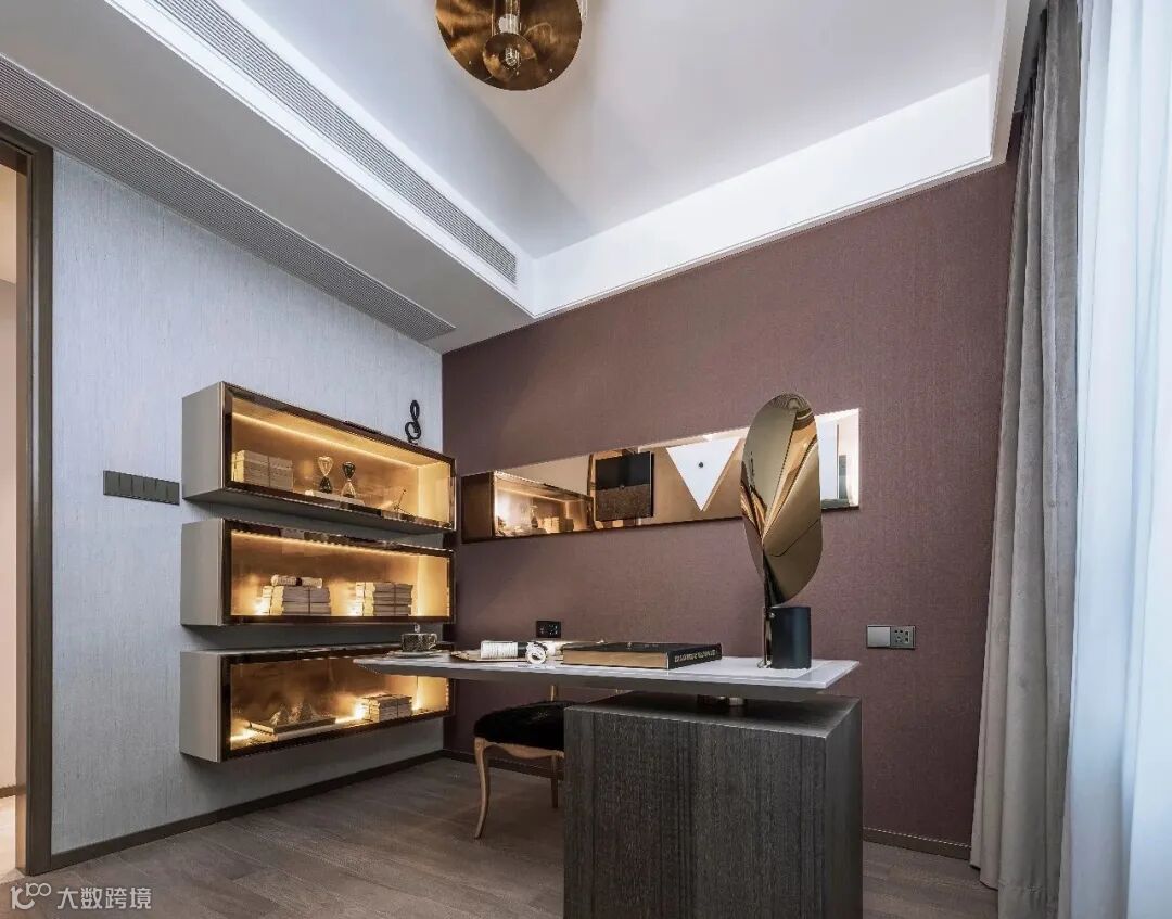 书房空间镀铬金属搭配玻璃素材,皮质呈现于低饱和度的亮色背景墙,家具线条呈工业设计的前卫感,柔和的背景墙和自然光照,展现了当代艺术的冷冽温馨感。