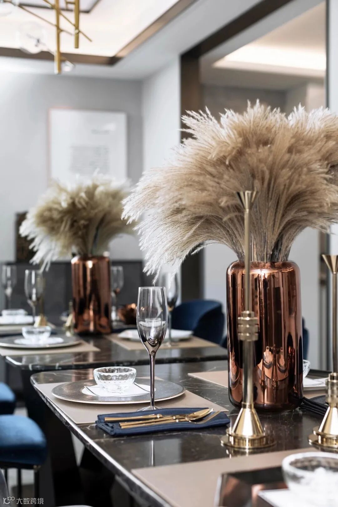 餐厅设计的细节上充满了仪式感,采用了镜面装饰,强烈设计感的金属材质的配饰和吊灯,简洁个性而不随便,蕴含着极具品位的贵族气质,使人在视觉和心灵上享受到双重震撼。