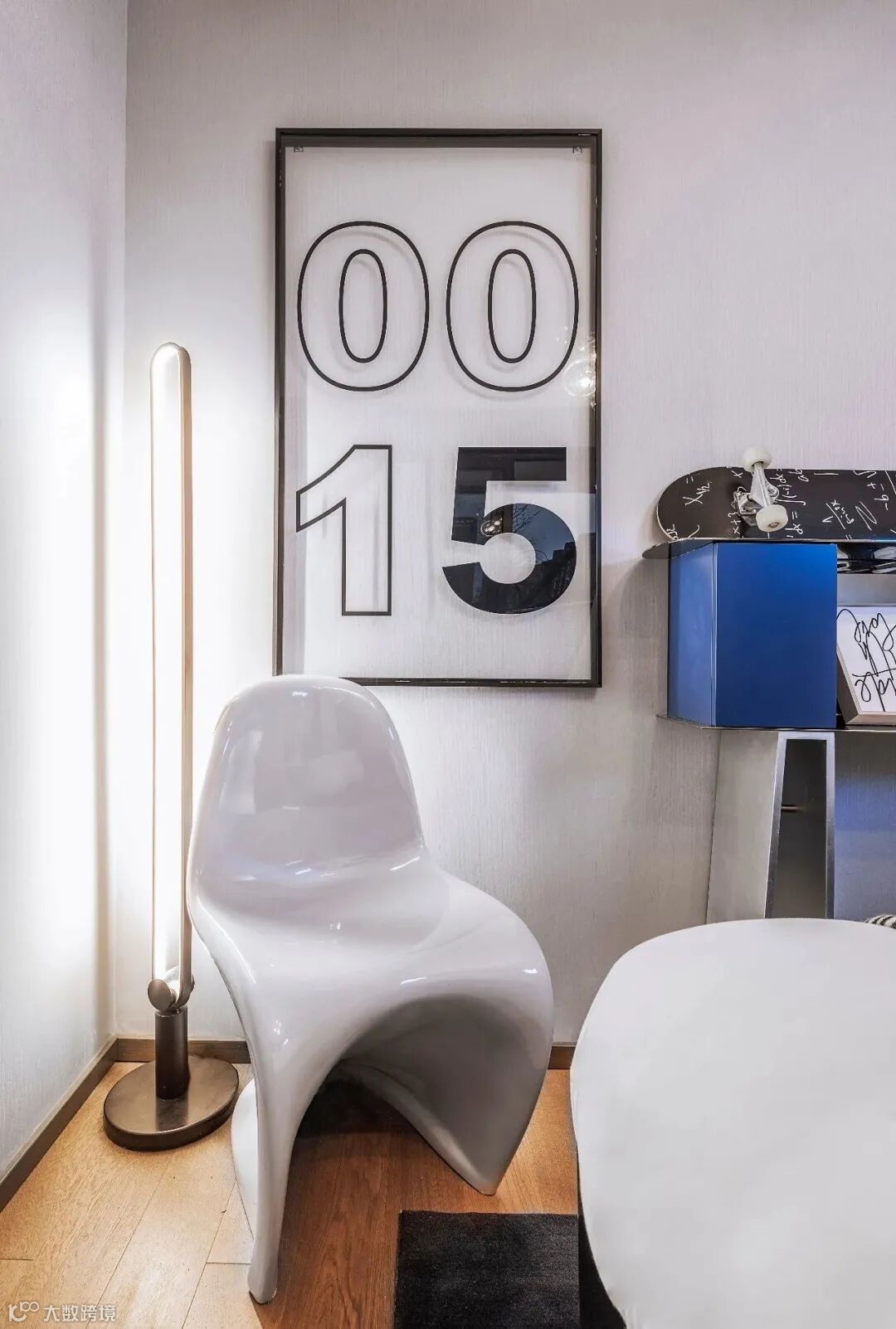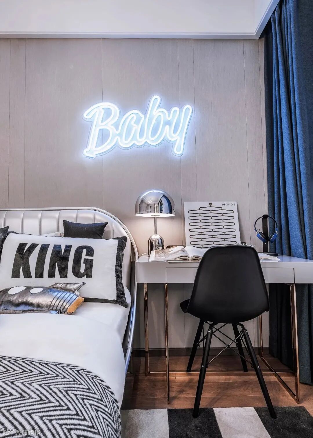 儿童房以蓝白灰为主色调,蓝色代表对未知的幻想,白色代表单纯童趣,灰色则代表个性,以滑板,运动为主题,辅以音乐,游戏功能,充满了欢快轻松的调性,同时活泼中带有一丝宁静。