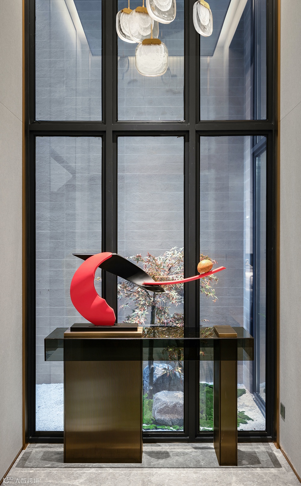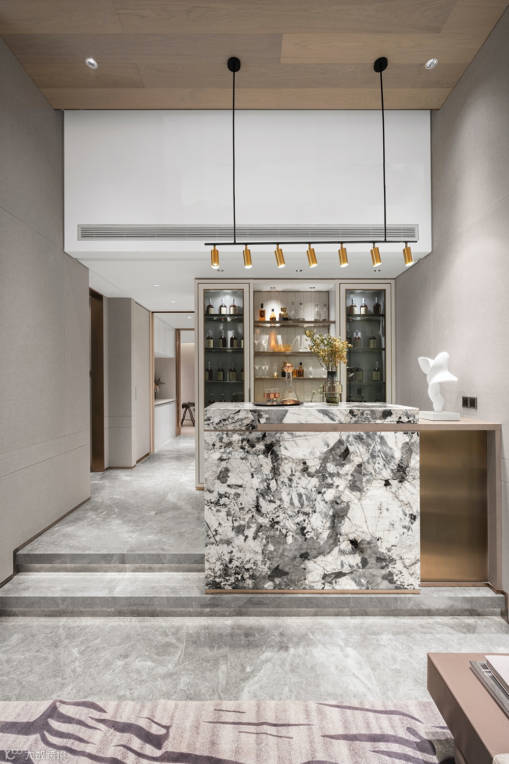 进门处的墙面饰以留白画幅,粗粝的自然肌理,极简的线条形成空间感,与充满当代艺术隐喻的雕塑组合在一起,增添了空间的趣味性。