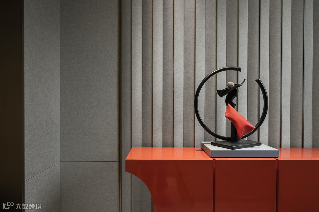玄关承担着室内外的转换,宜藏风聚气。设计师在这里设置了流水型艺术雕塑,优雅的弧度和曲线之间,轻松优雅的气息弥漫,让人在进入家门的瞬间感受杨柳般的微风拂面,放松身心。