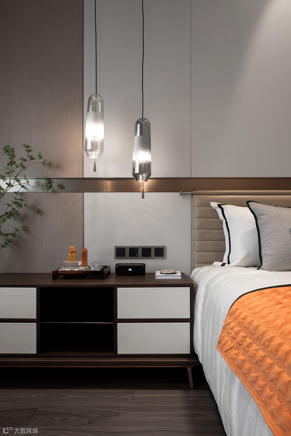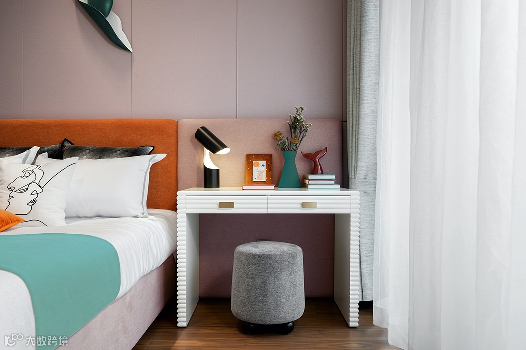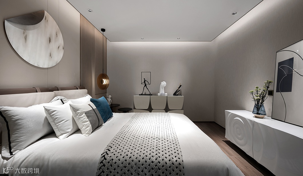 次卧如月光般温润舒适,床头背景挂饰如未满之月,鞠一捧水,夜的露珠在蛙声中滴落,在电视柜的湖面上泛起层层涟漪。