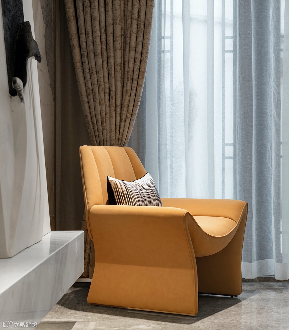 客厅空间色彩体系源于自然,犹如夕阳下波光粼粼的江面,落日余晖在挂饰和地毯间折射辉映,带着一点微醺的眩晕,归于静谧安然之中。