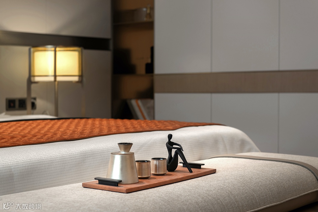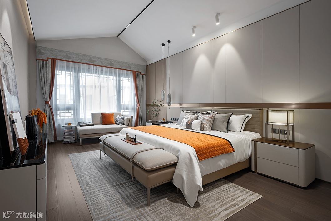 主卧的异型天花延续了古城建筑特色的精髓,配以温馨暖色调,营造出洗练纯粹的空间精神。