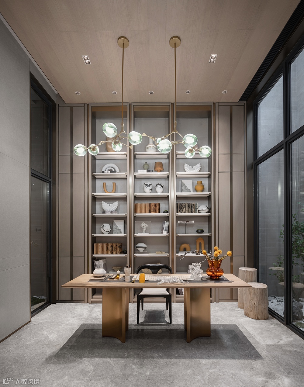 开放式书房暖色的木饰面,灰白色的墙面,以严谨而轻松的笔意,以求诗梦般的写实与写意。