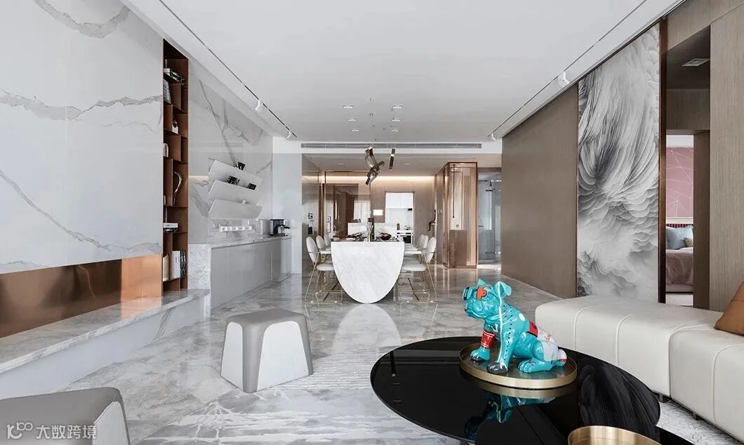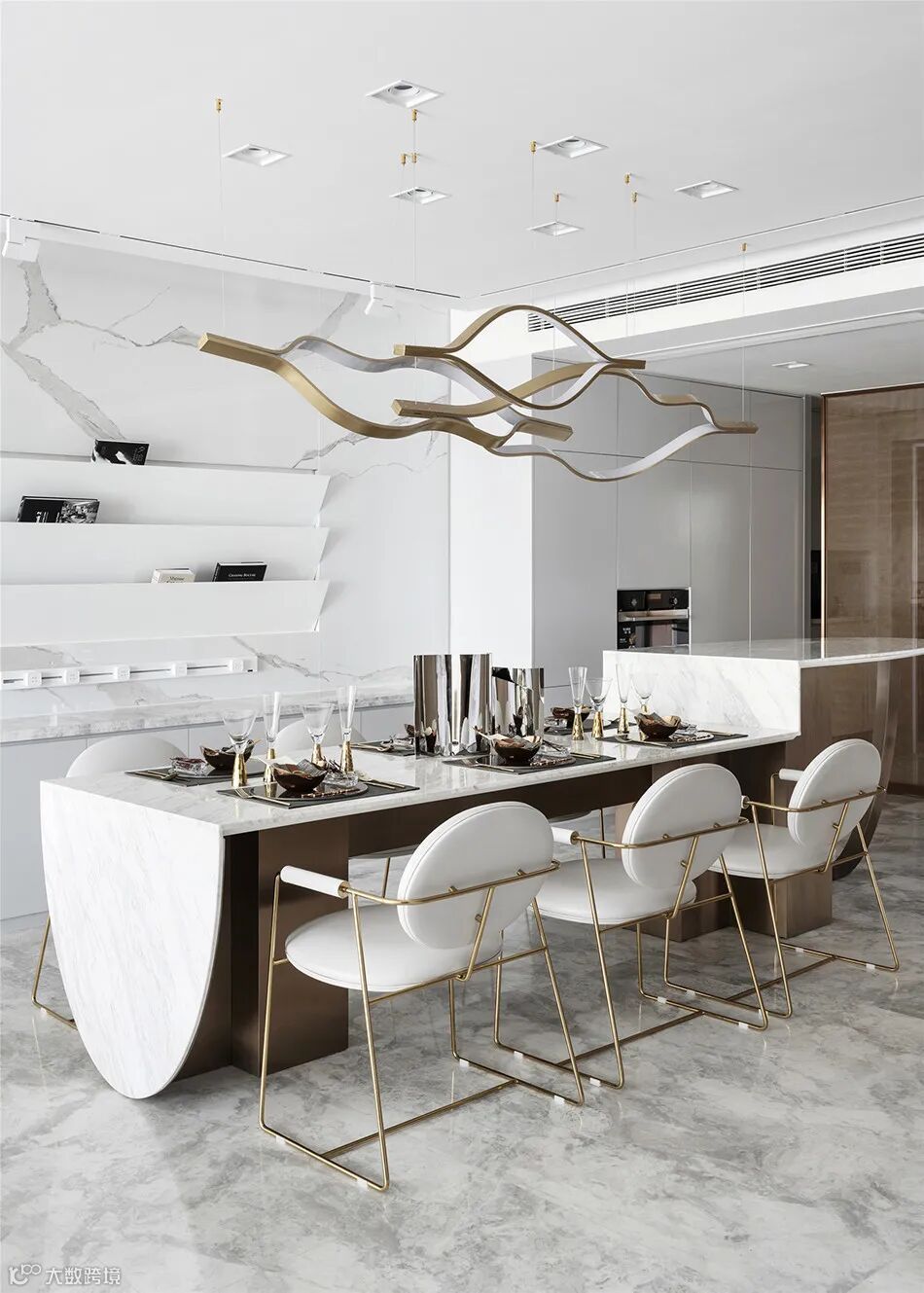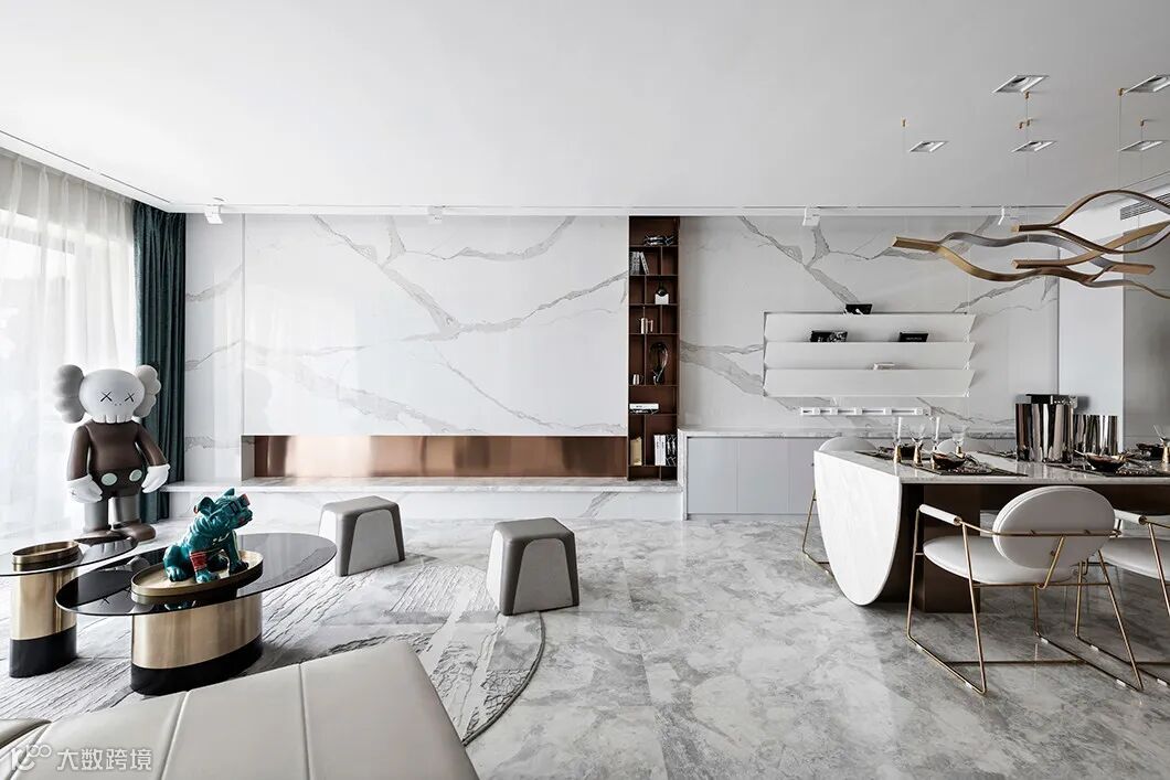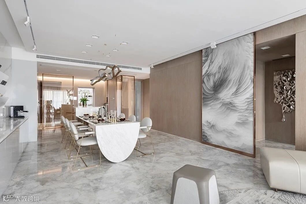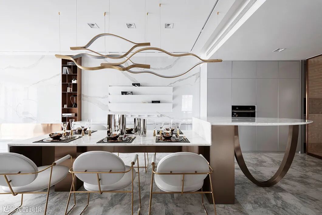 一体式的餐桌及吧台,转折的台面将整个空间打造得现代且别致,石材、金属与皮革融合,使得整个客餐厅空间精致度又得以提升。