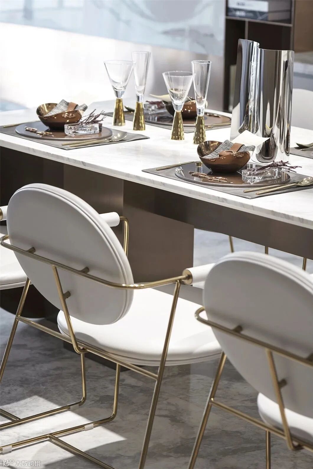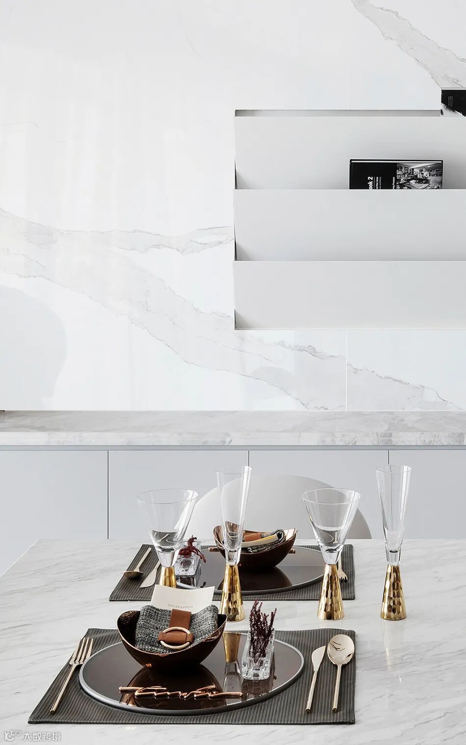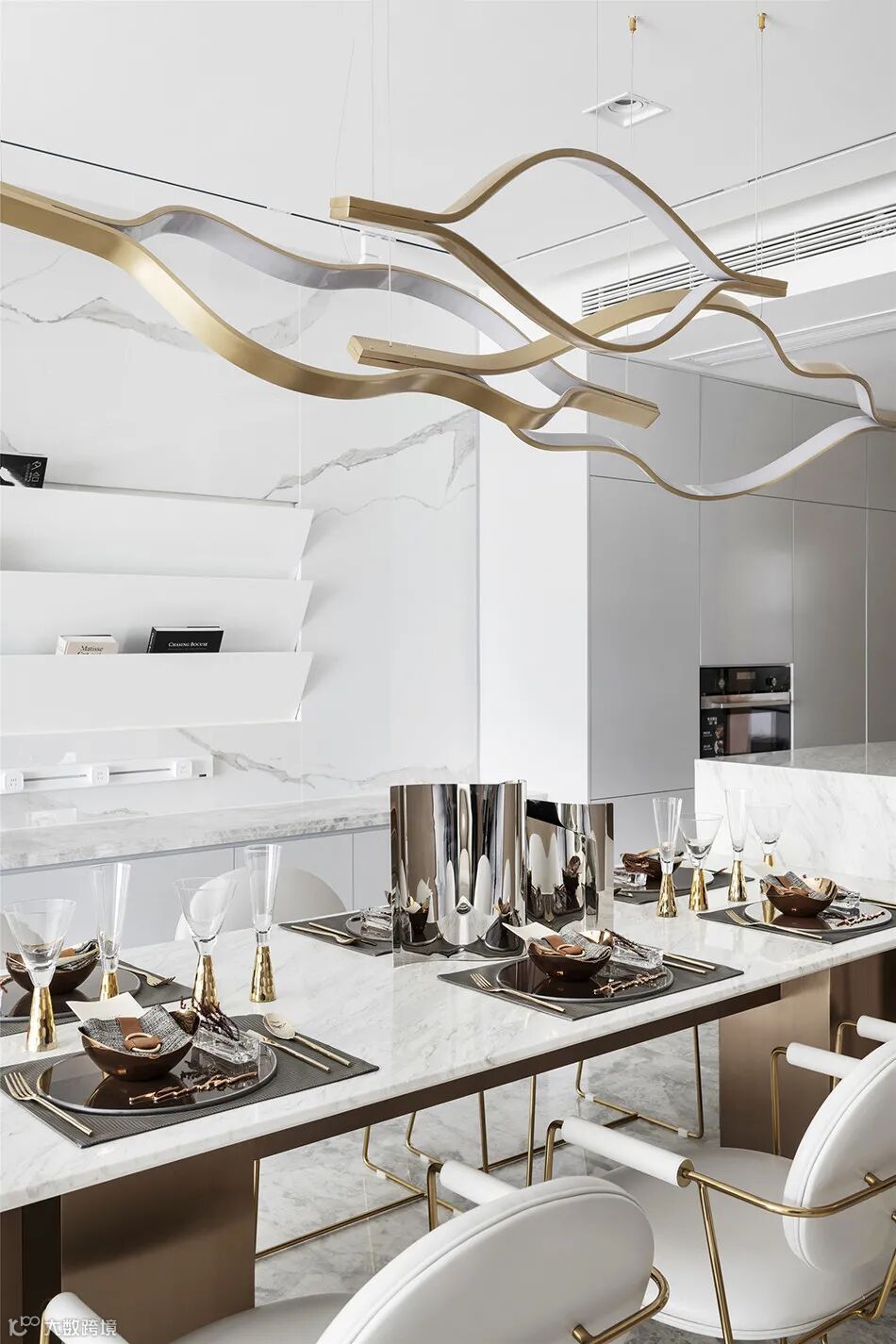 一体式的餐桌及吧台,转折的台面将整个空间打造得现代且别致,石材、金属与皮革融合,使得整个客餐厅空间精致度又得以提升。
