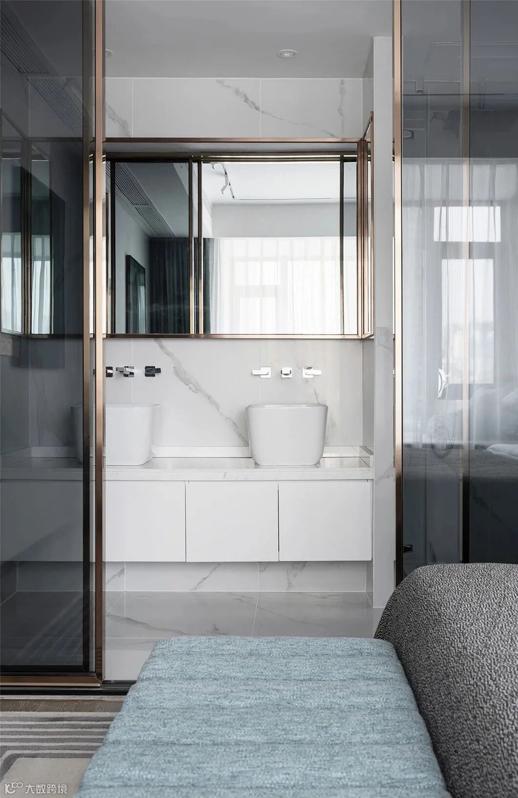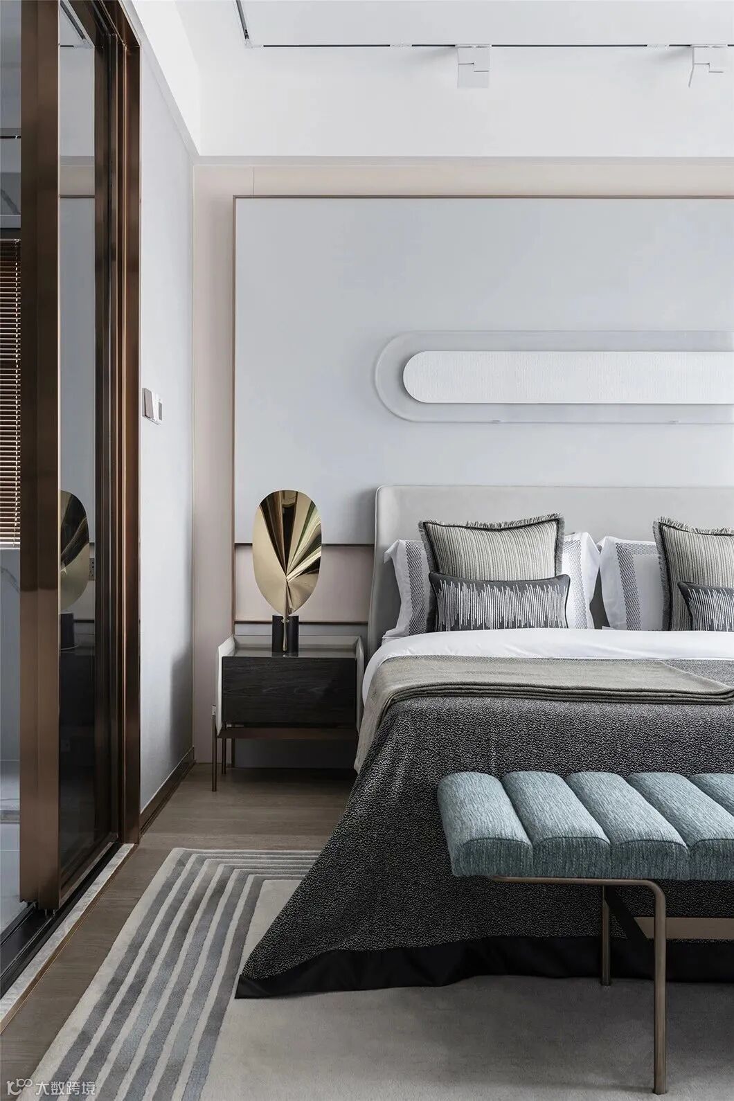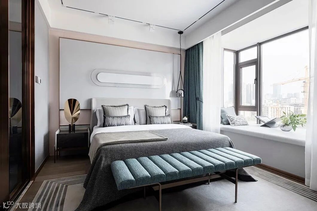 主卧硬装造型致展现出强烈的现代感,床背景挂画用亚克力与纯净的、肌理特殊的白进行材质上的对比,将颜色主要集中在床尾凳、窗帘上,用素雅高级的灰色,突显质感。