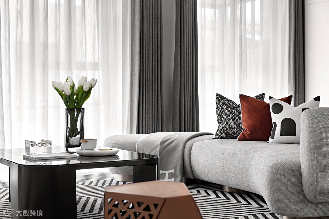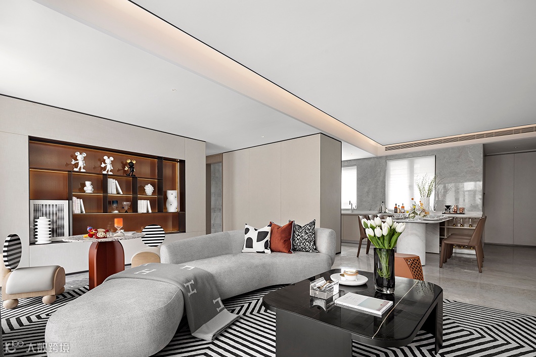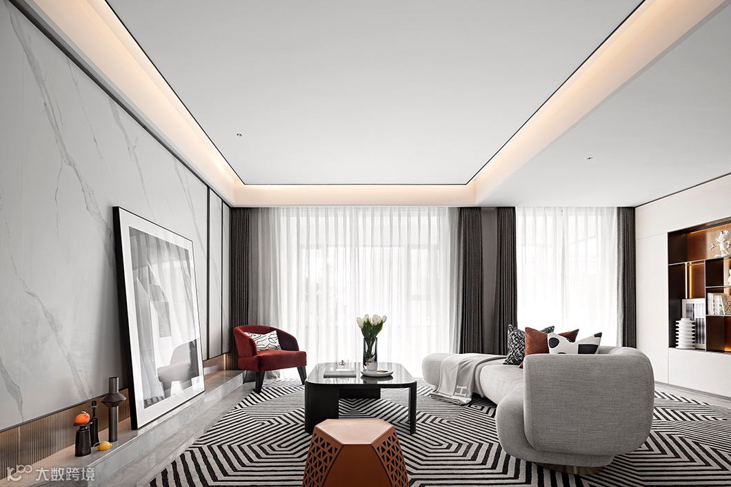 会客厅的时尚装饰中带着柔和与灵动,几何图形的地毯与光洁的地面相映衬。素雅洁白的大块颜色明快简洁,力量中融合了一丝典雅的气息。