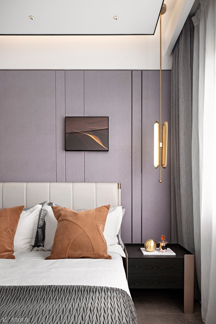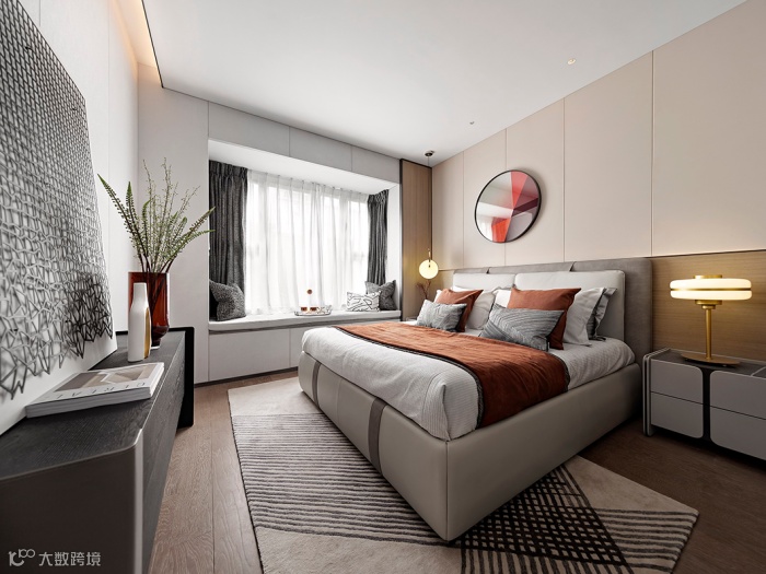 卧室以暖色为主,木纹元素、红棕色调,艺术调色盘打造休闲与温馨的空间。