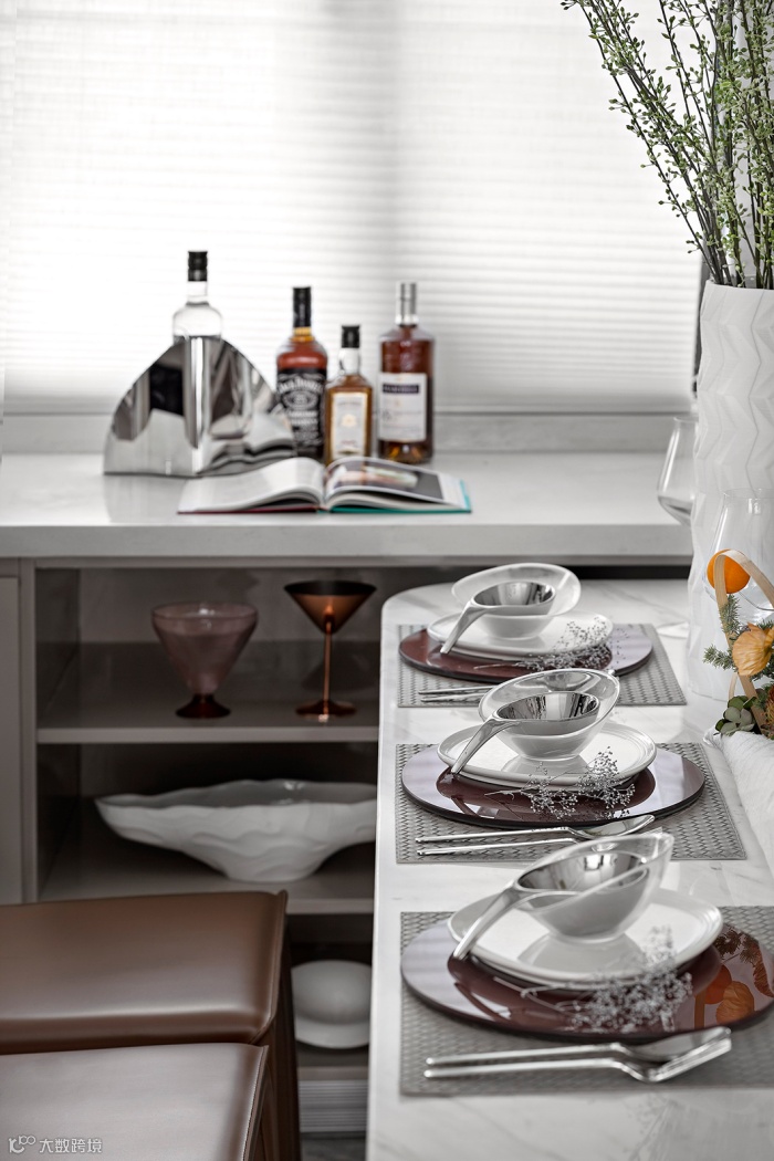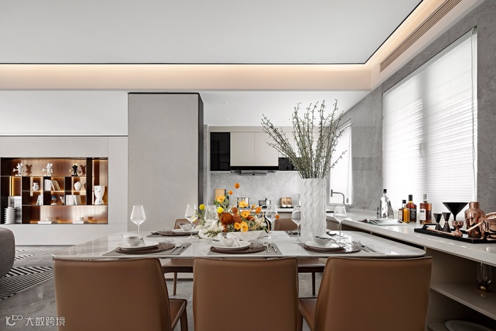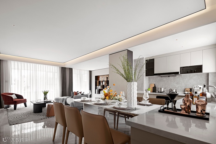 客厅与厨房并无间隔,联动式的设计提升空间效率。大飘窗接入餐厅,一箪食一瓢饮之间,美景与美食相得益彰。朴素大方又不失精致,让生活充满情调。