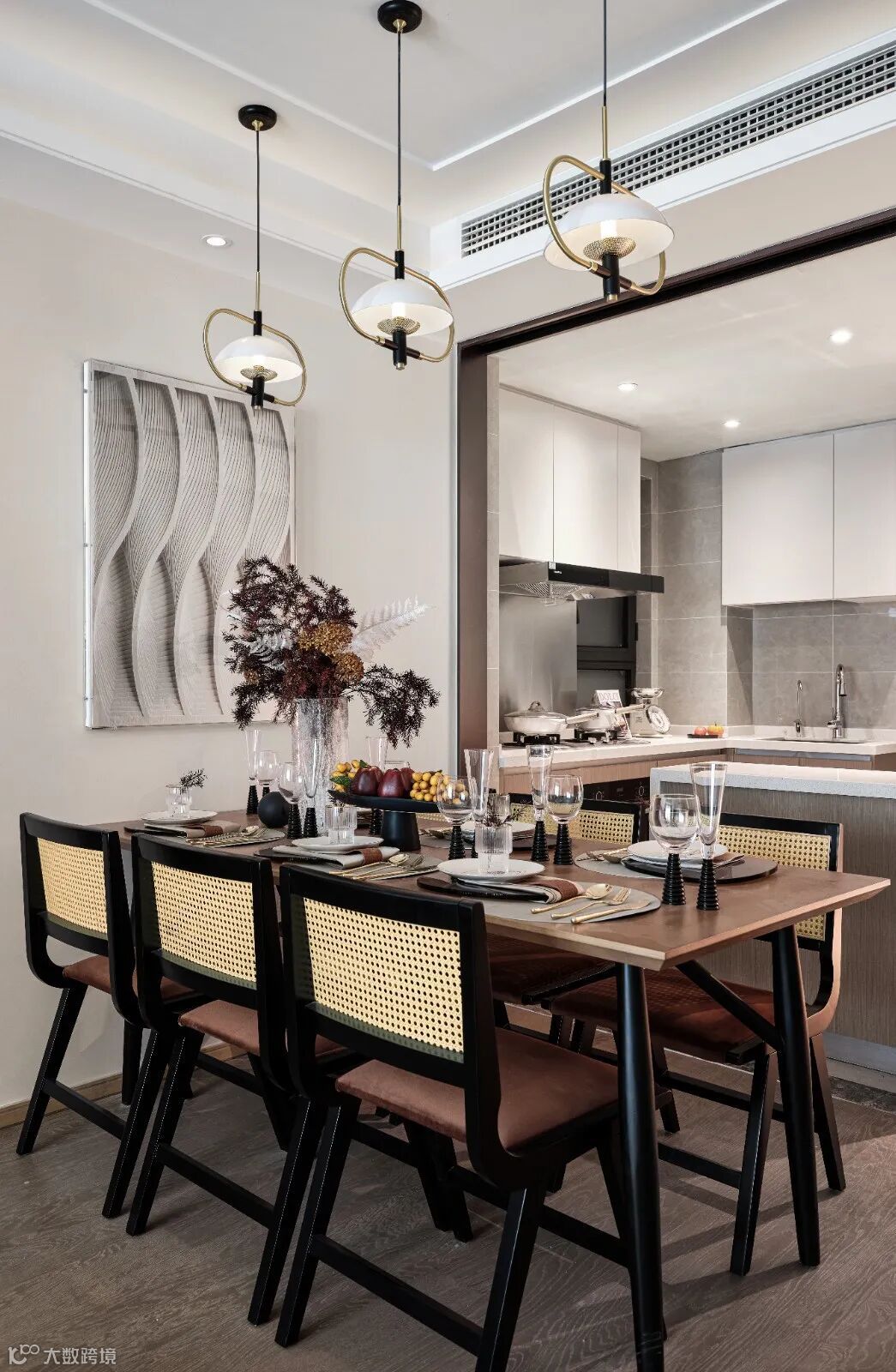 每天围坐在餐厅的就餐时光是家人分享生活的最佳据点,餐椅借鉴比利时VERDON设计师椅,用红棕色的丝绒面料代替了常规的藤艺坐面,让餐椅的中古气息更加典雅奢华。