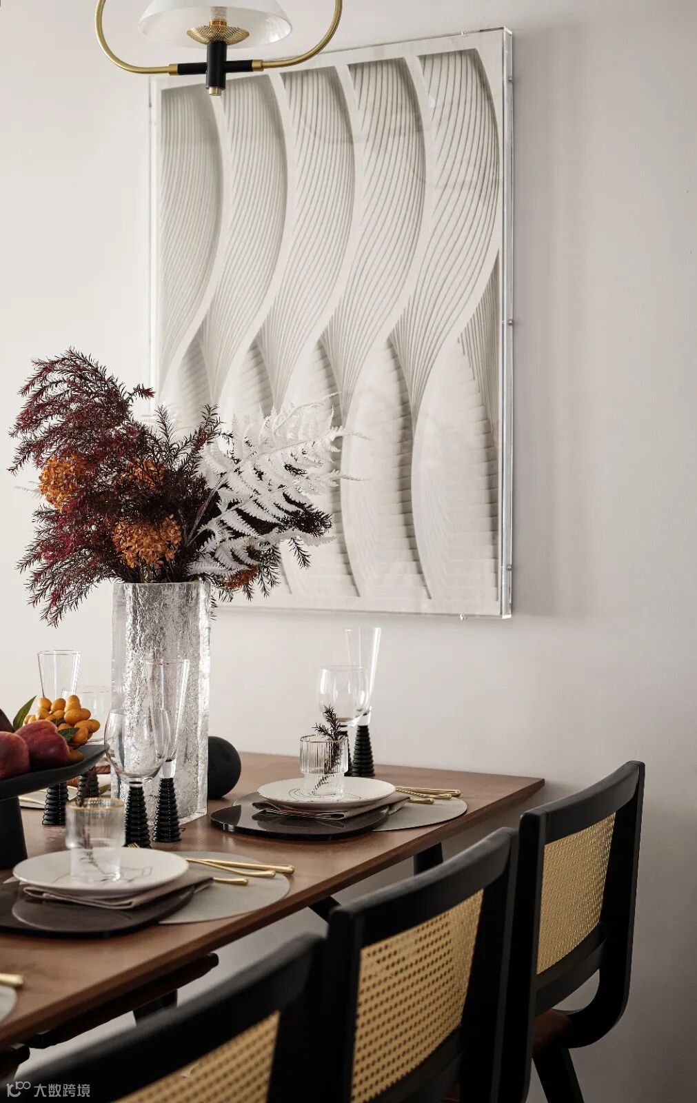 灰褐色的实木桌面、造型独特的黑色餐具、自然风干的花艺植物,让整体空间充满丰收的愉悦,又有踏实的安稳之感。一幅抽象绘画作品,从立面自然分割空间视线,将静谧收于画框,无尽欢颜显于画中。