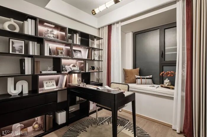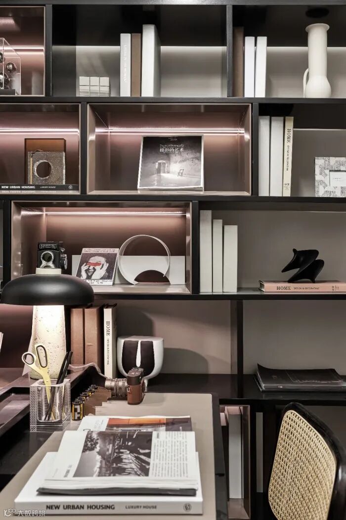 书房兼工作室是主人生活爱好的聚集地,丰富的装饰品将主人的生活印记装进了书柜里。