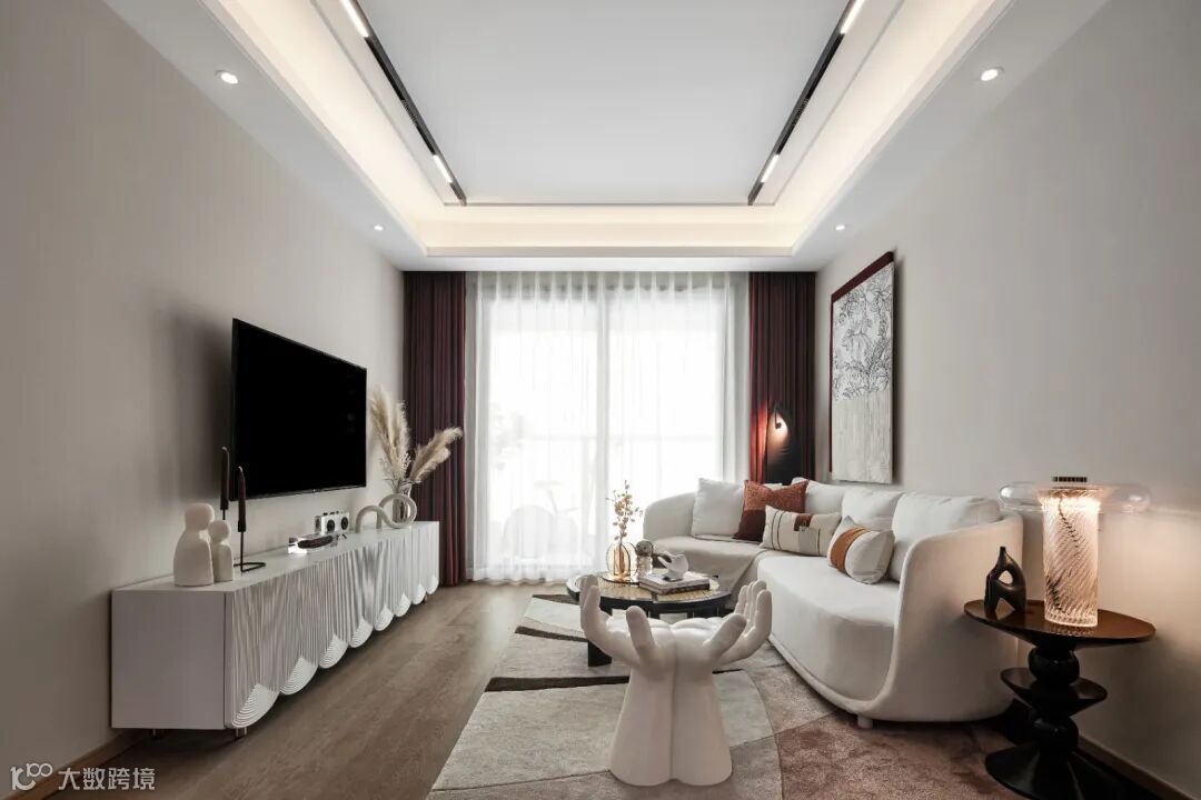 客厅空间主要以白色调为主,用轨道灯取代了常规的主灯设计,材质独特的吱音落地灯与玻璃台灯,丰富的光影让空间充满层次与共鸣。