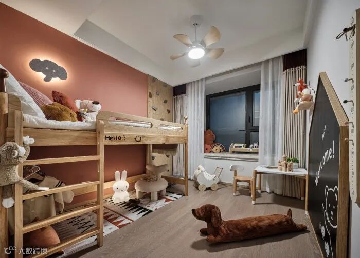 次卧多功能儿童房更是亮点,小空间被设计师“折腾”出了花样,原木的高低床利用空间搭建出一个迷你书吧与衣帽间,临窗而建的攀爬墙满足孩童的冒险精神、标注岁月的身高尺、动物造型的小台灯,都记录着小主人的成长故事。