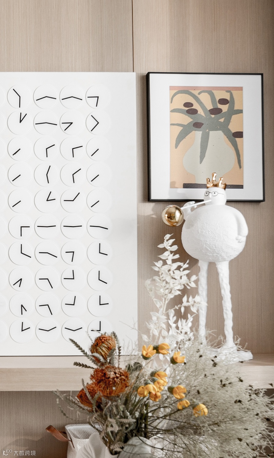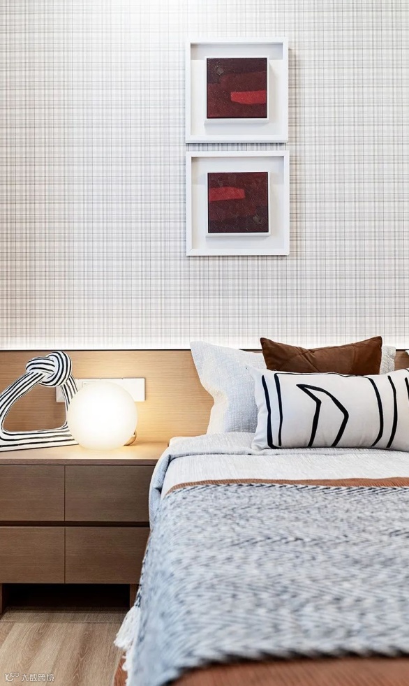 简约线条背景墙,错落有致的挂画,简洁舒适,整体搭配让人在空间中不自觉的放松。干净流畅的线条和精心的布置是空间的亮点,接近自然、简单配色,不必隐世,却能返璞归真。
