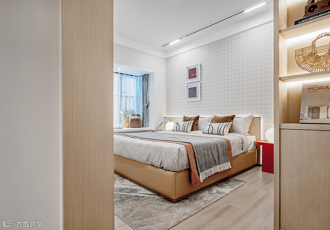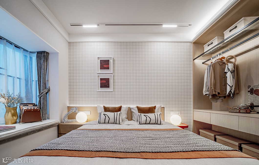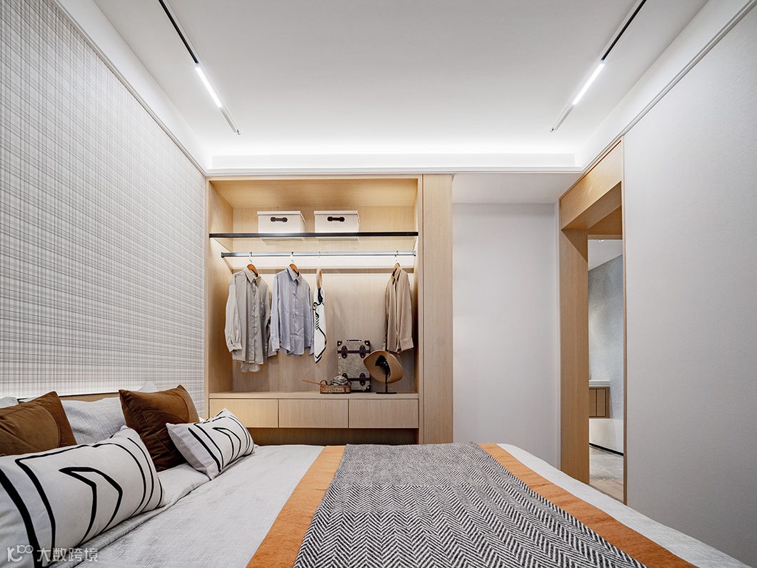 主卧延续典雅浅淡的基调,大面积的原色木材延伸空间各处。不太讲究过份修饰,强调展现材料的本色与本质。