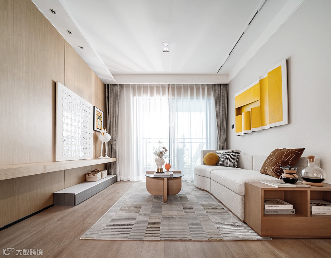 客厅以白色和原木色为主色调,搭配简单干练的家具,以精简的软装加上综橙色作以点缀。原木材质,拥有着丰富的肌理、天然的质感,给人体味最古朴温暖的纯净情绪。