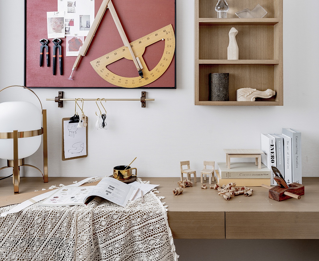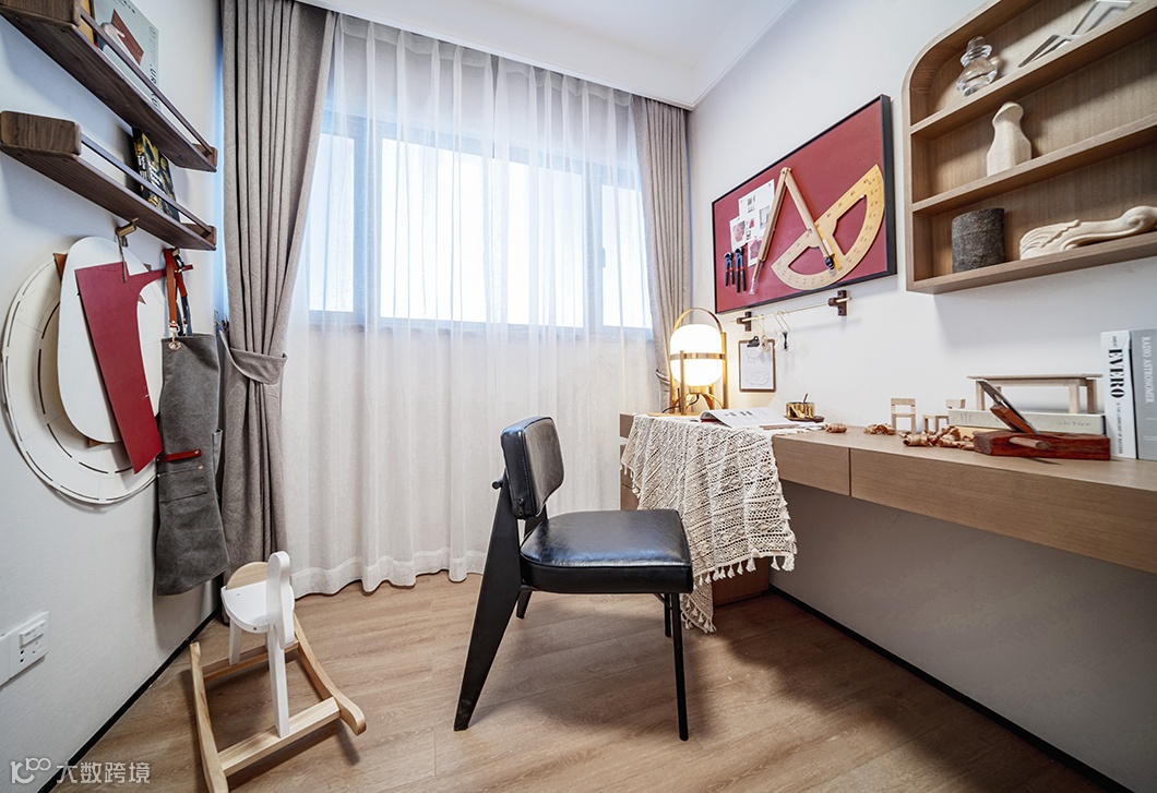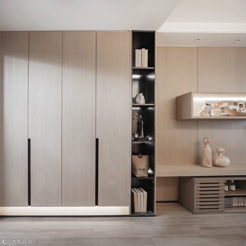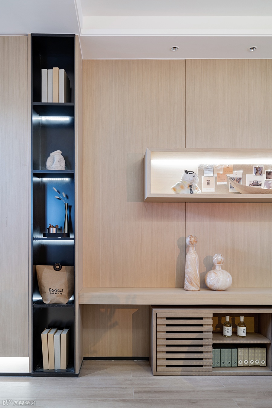 书房用简单的板材与量体结合,尽量保持空间极简纯粹的感觉,高低错落的原木色体块穿插其中,整体优雅自然。
