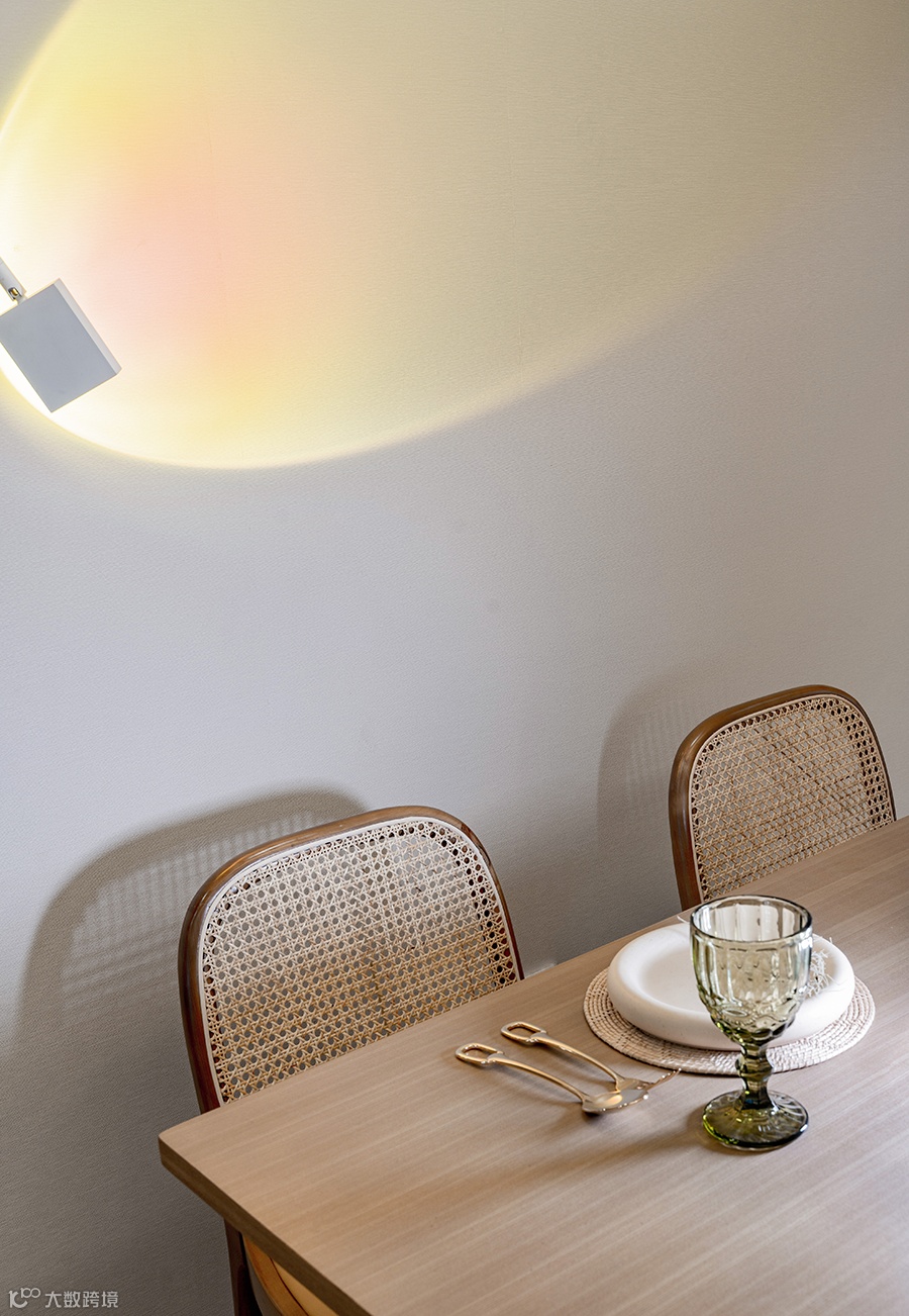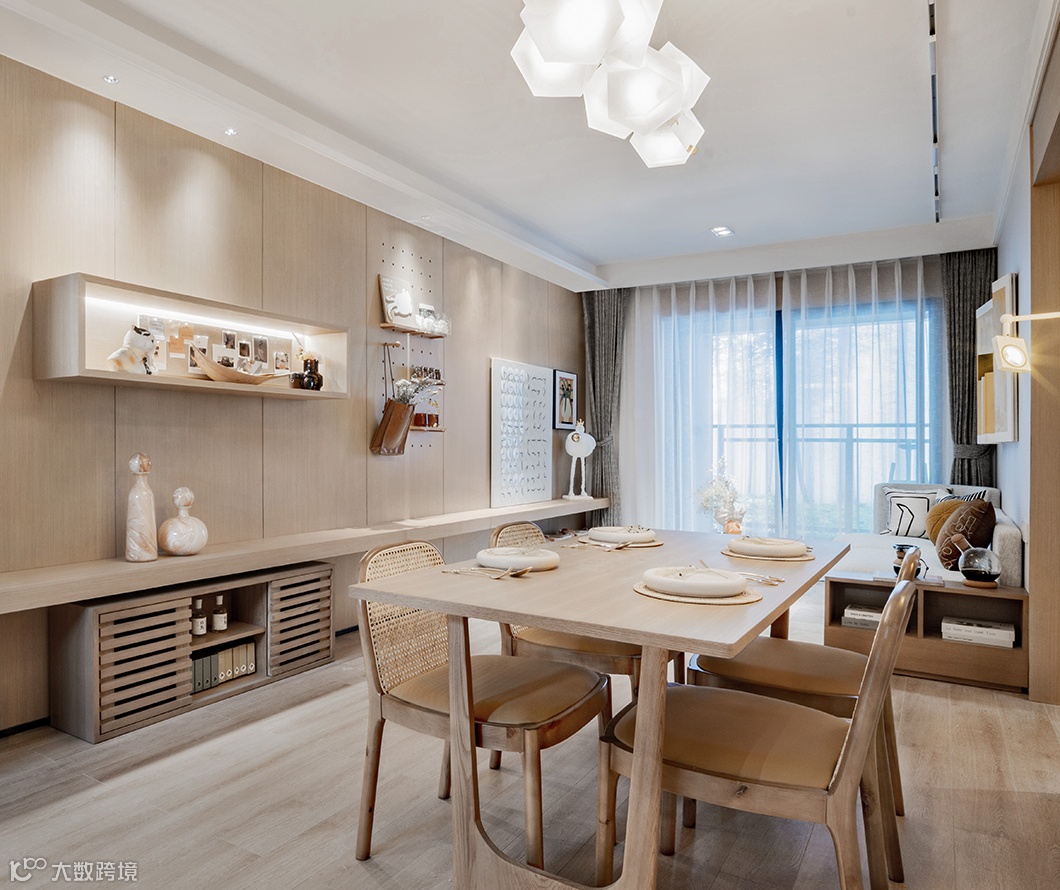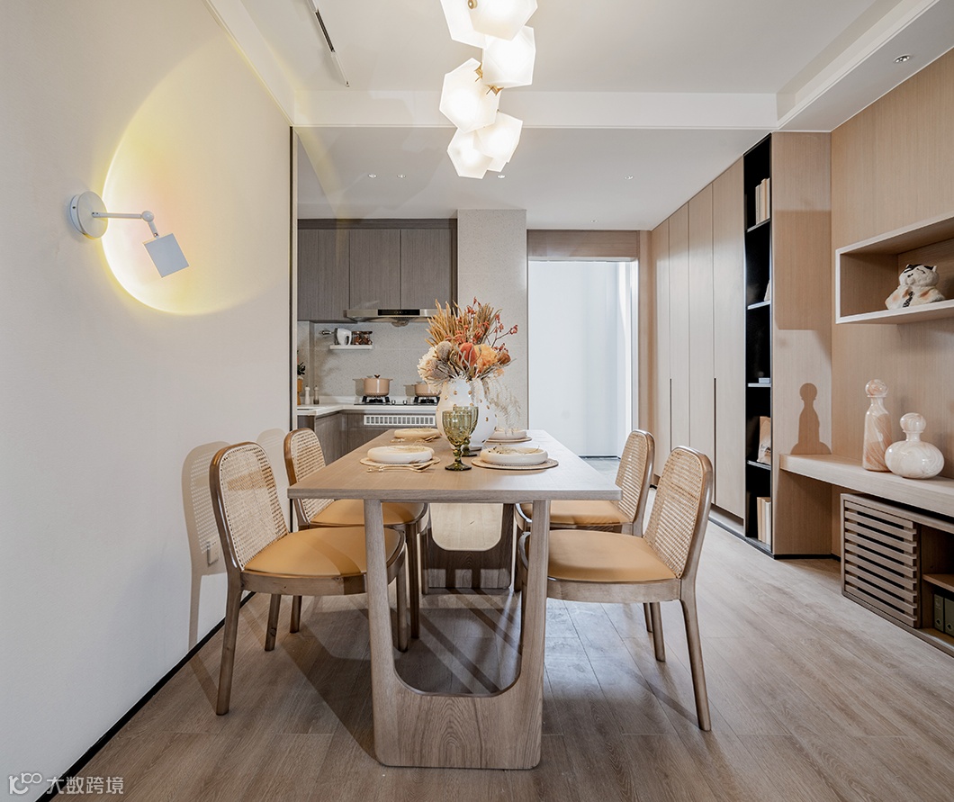 餐厅和客厅使用一体化设计,连为一个整体,视野开阔。餐厅的设计采用天然材料,用最柔和的颜色,最真实的纹理,表达最淳朴的生活。造型别致的吊灯,打造了一个舒适优雅的就餐环境。