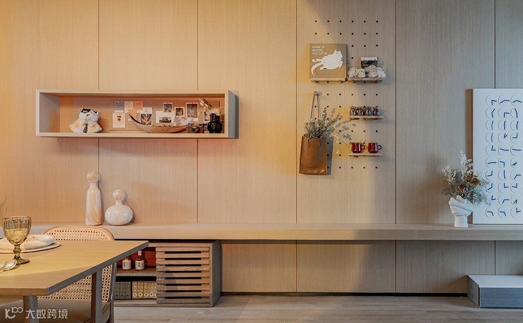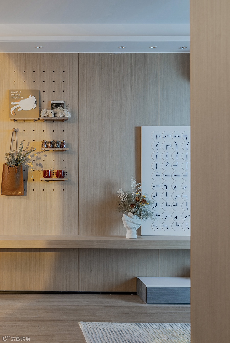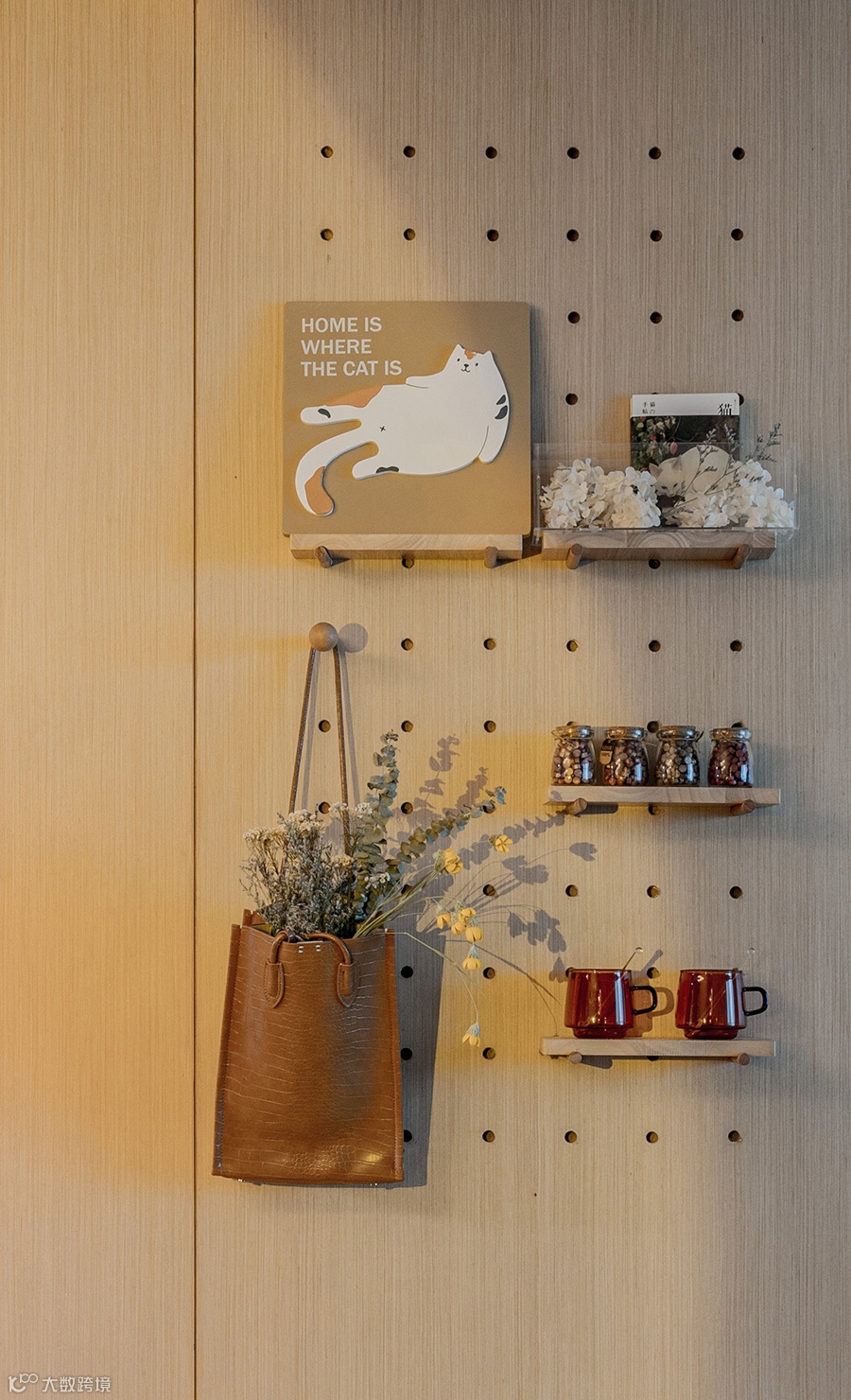墙上的洞洞板、玻璃瓶里的小木头、挂包里的干花,装点出纯粹质朴的生活。