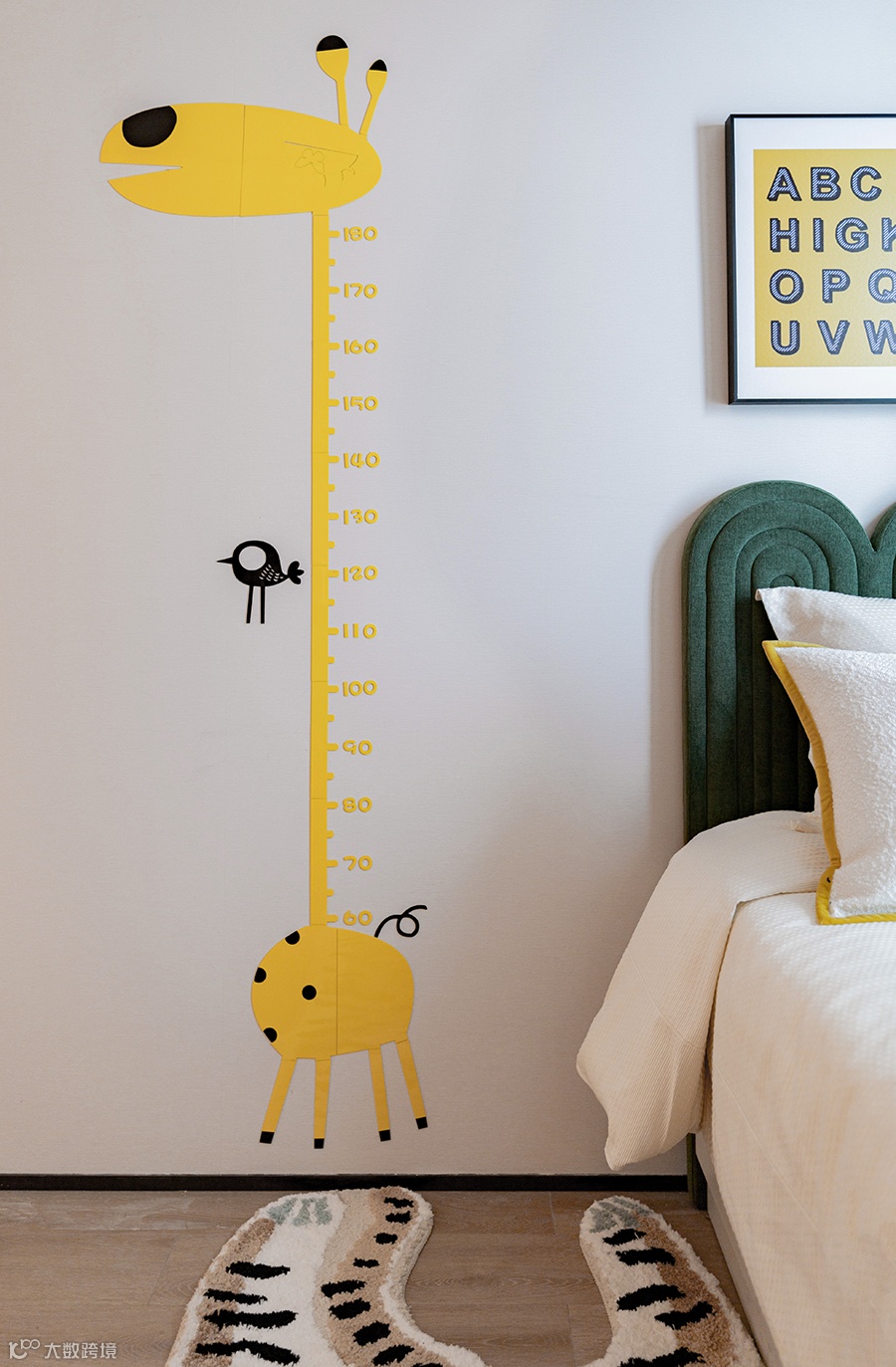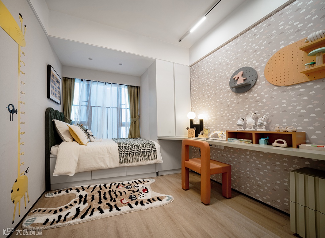 儿童房给人以温柔宁静的舒适感受,各种动物元素的摆件饰物给原本静谧的空间增添了些许灵动与设计感。