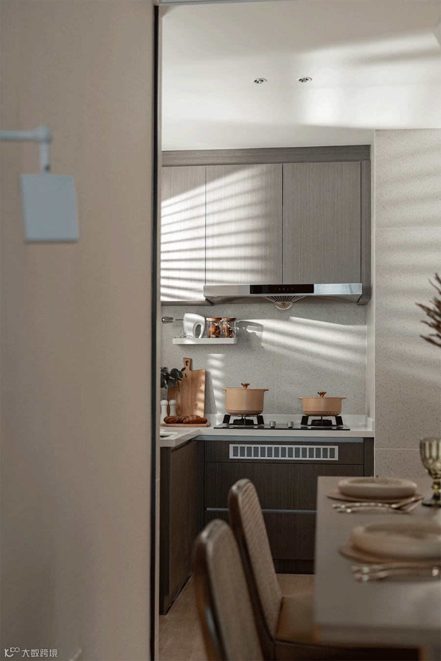 开放式厨房利用水磨石墙突出主体,使用自然中的元素来提升品质,通过一些细节的地方来把控整体,去除了繁琐的设计装饰。