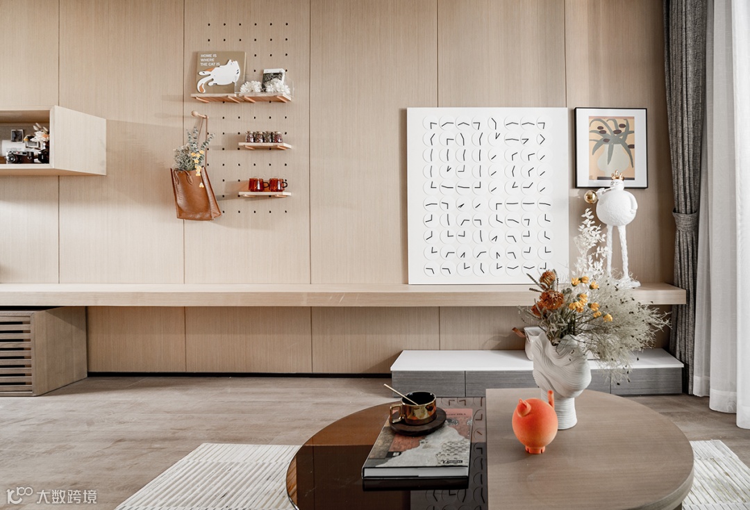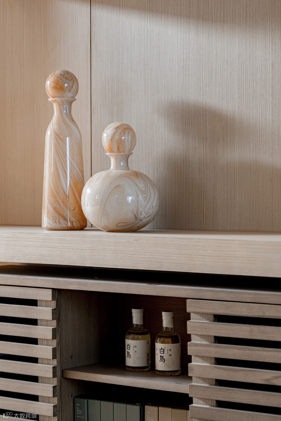 木材天然的纹路肌理,温润的质感,非常容易给人亲近的感觉,消除了现代极简空间的单调感,温馨舒适之余让空间富有活力。