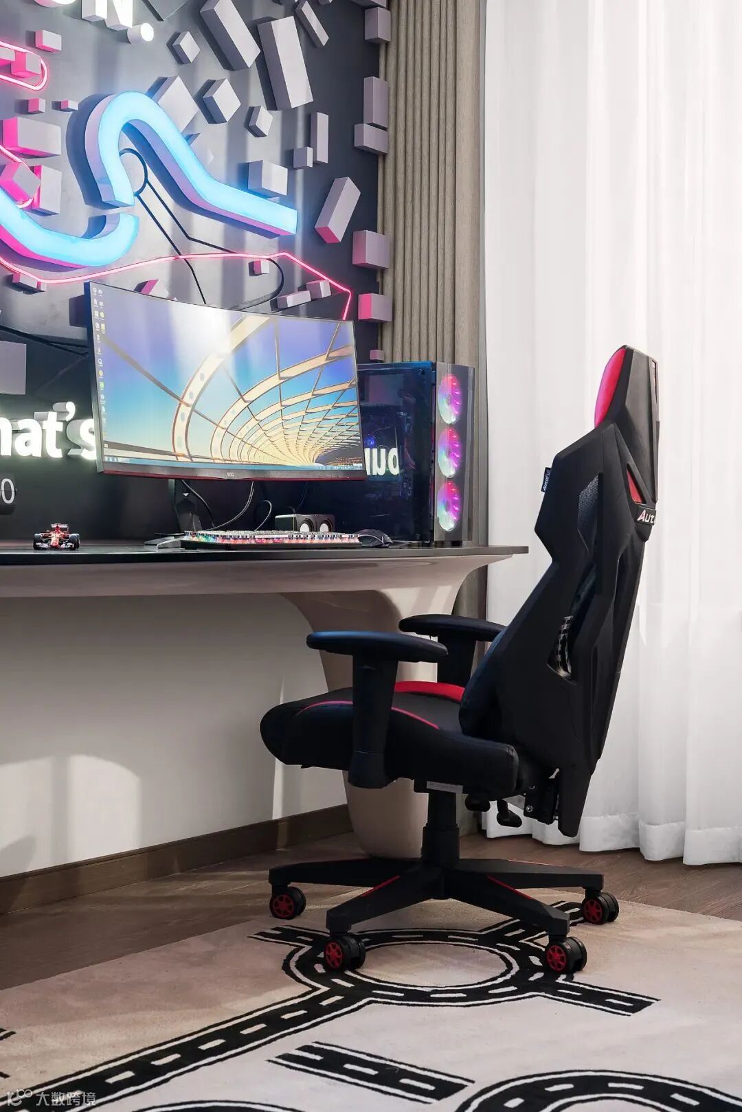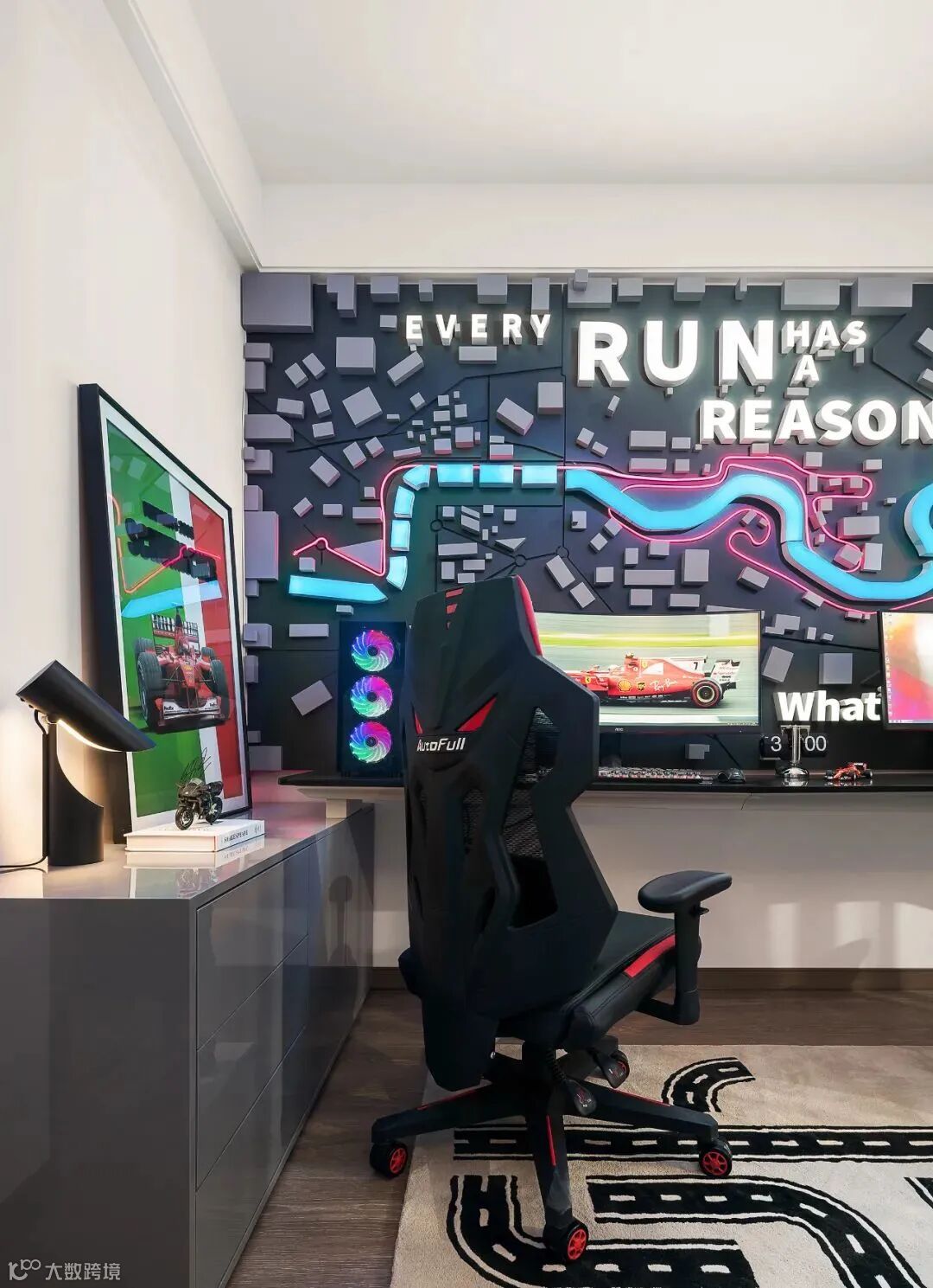 在家拥有一个电竞房,是多少年轻人的执念。设计师深刻洞察当代青年群体的需求,摒弃复杂的形式主义,以充满未来感的电脑装置作为装点,仅有的挂画与赛车手办是对细节精准的把控,强而有力的说明居者的兴趣与爱好。