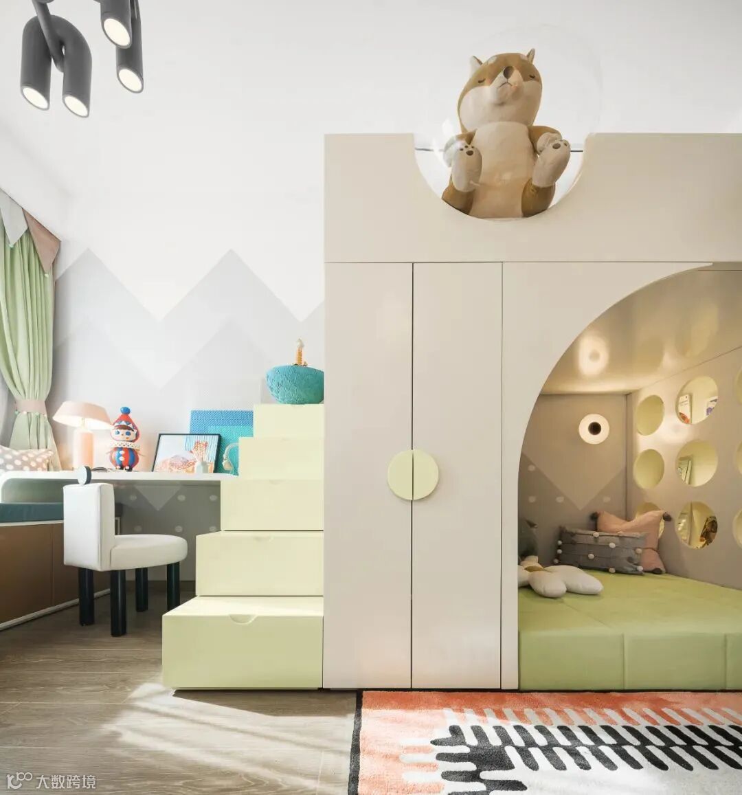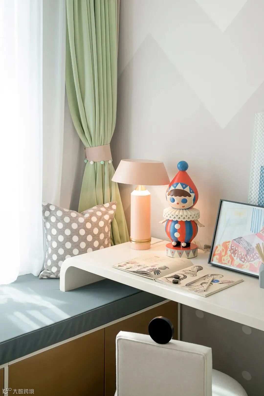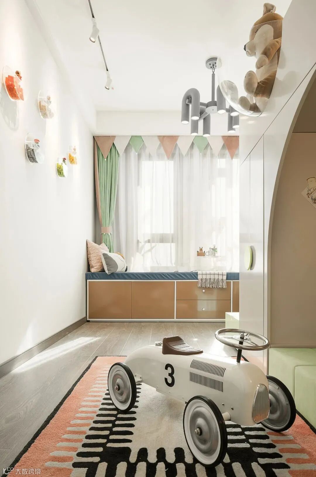 在儿童房的设计与色调上,要特别注意安全与美观的搭配原理,在各处细节选用柔和、软绵的材质进行围合,体贴度直抵童心。