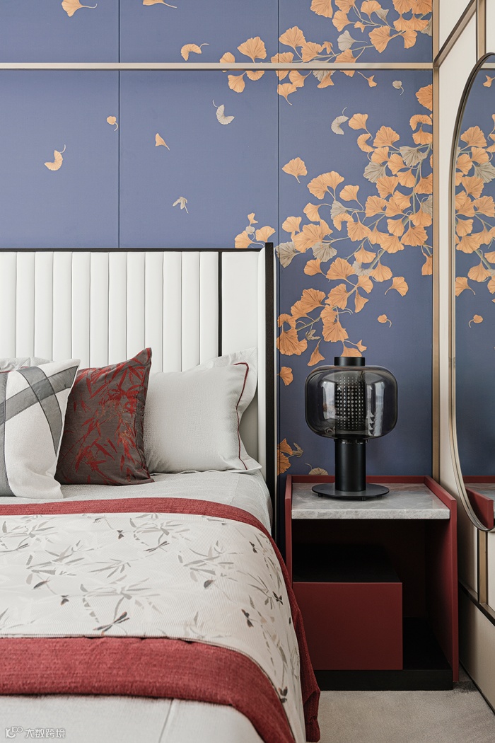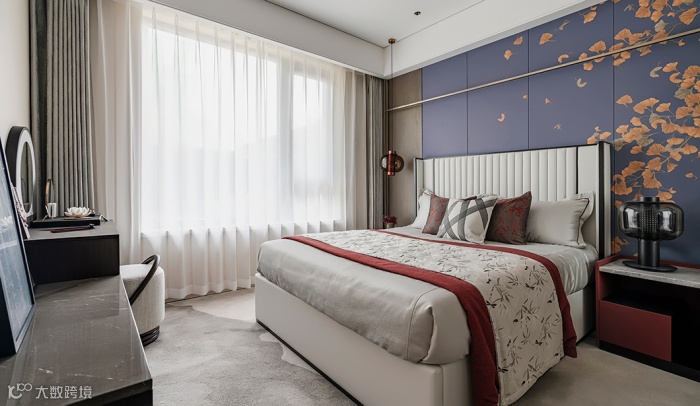 卧室以灰白黑中色为主,故宫红作为辅助,让古朴的中式意境透漏出婉约温柔的气质。