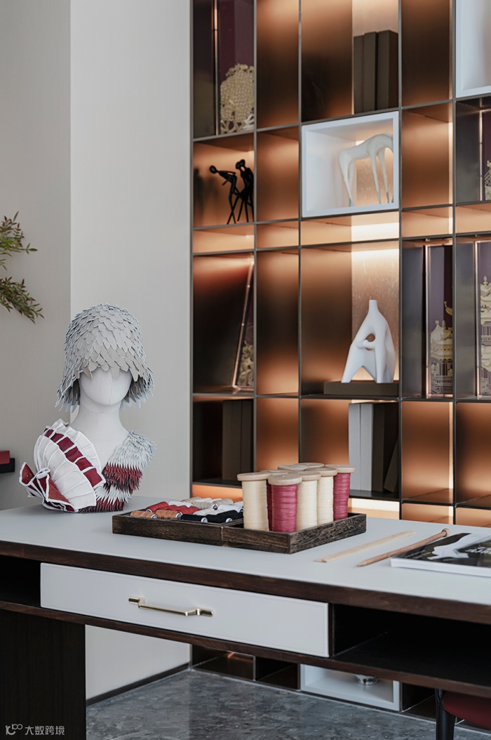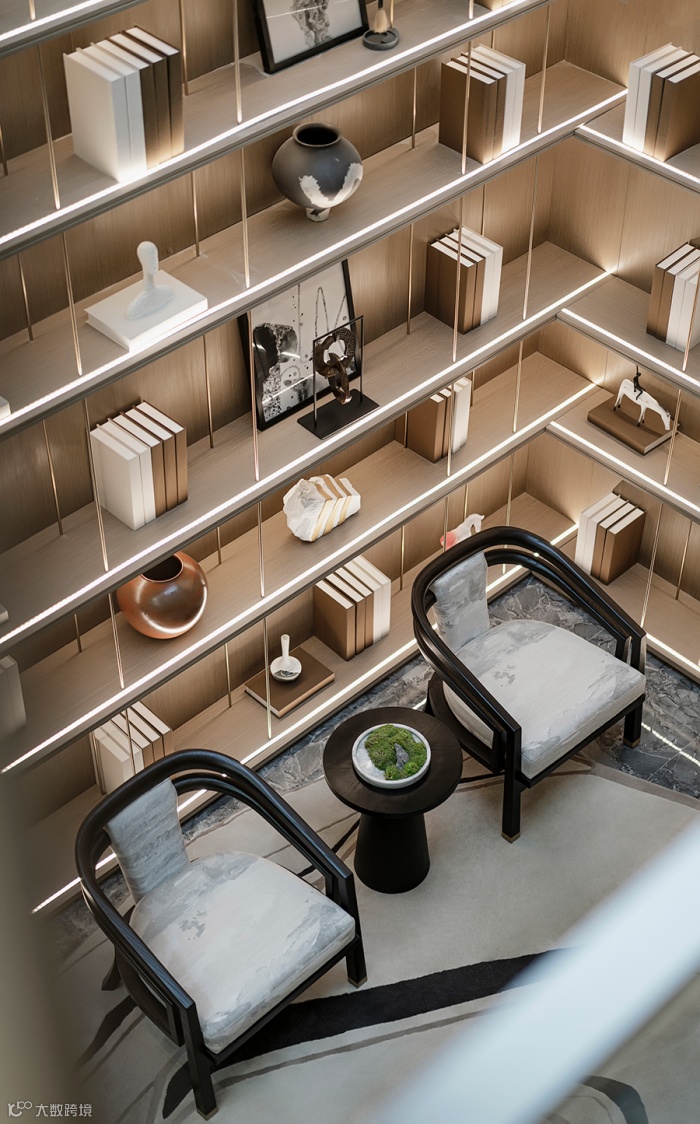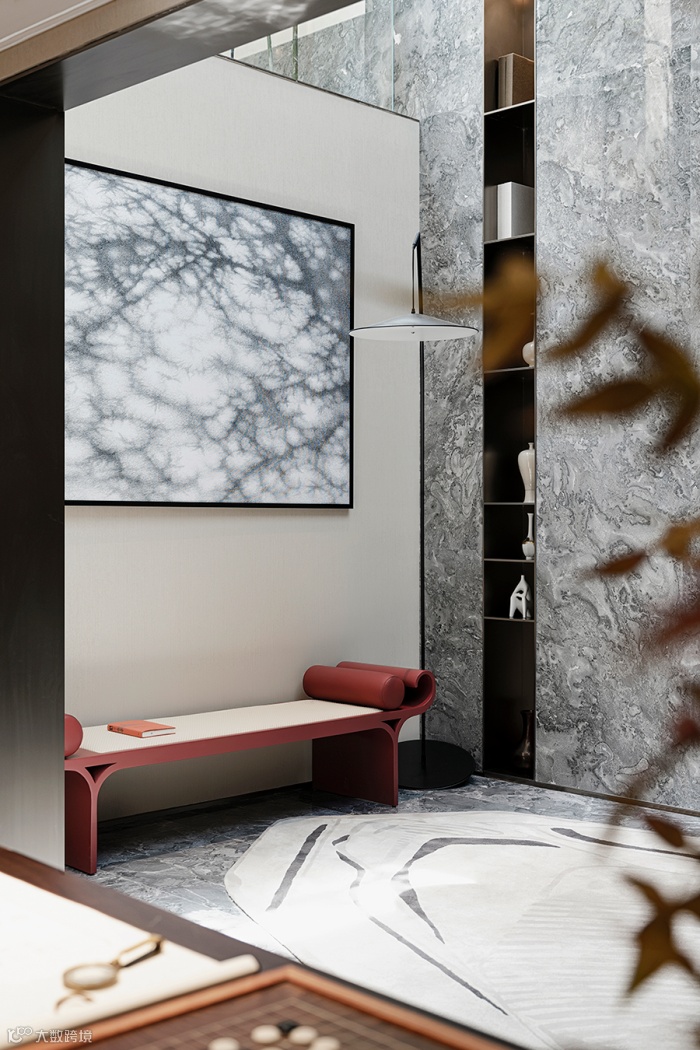 书架上的艺术品整齐排列,光影温柔浪漫带给空间延伸感;不规则的地毯呈现出灵动雅致的当代美学质感,营造东方文化的意境空间。