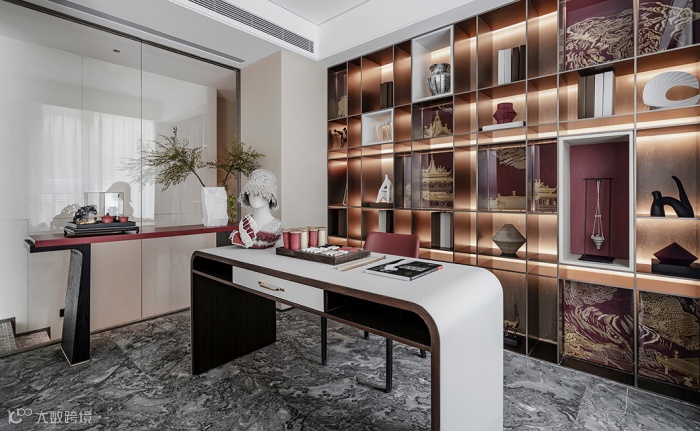 设计师摒弃繁复的色彩,书桌运用白色与黑色,故宫红点缀其中,使整个空间带有深厚沉稳的底蕴,显得优雅而又严谨。