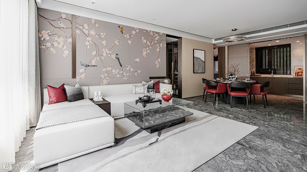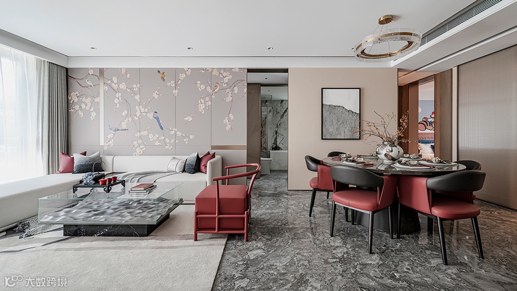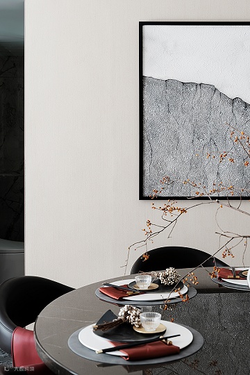 本设计将东方美学融入北京路劲御合院,营造一种悠然的“慢生活”。空间以高级的灰色调为主,L形沙发与圆形餐桌碰撞。