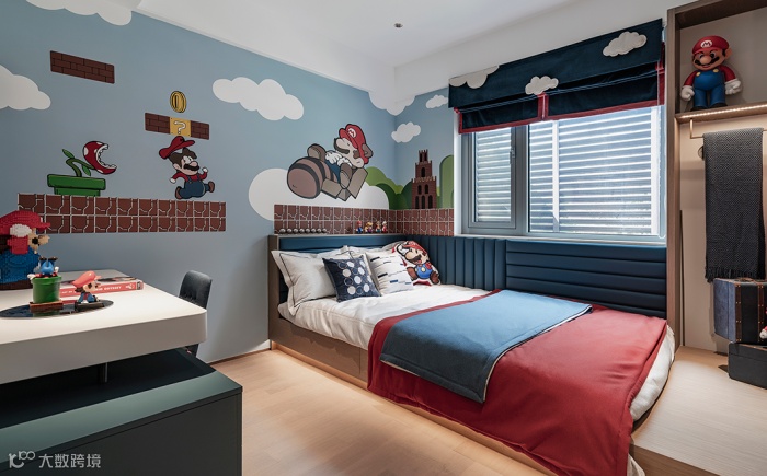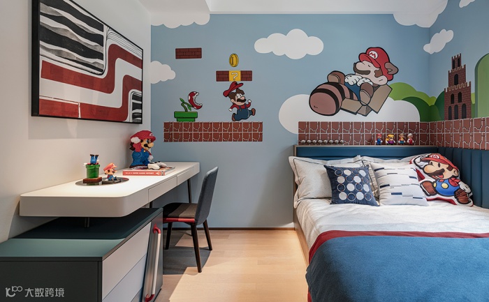 儿童房被设计师添加动漫元素,马里奥满足孩子的好奇心,带他们在冒险的世界遨游。