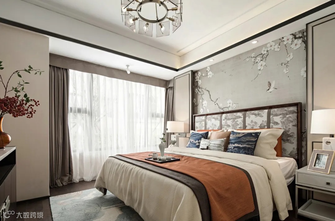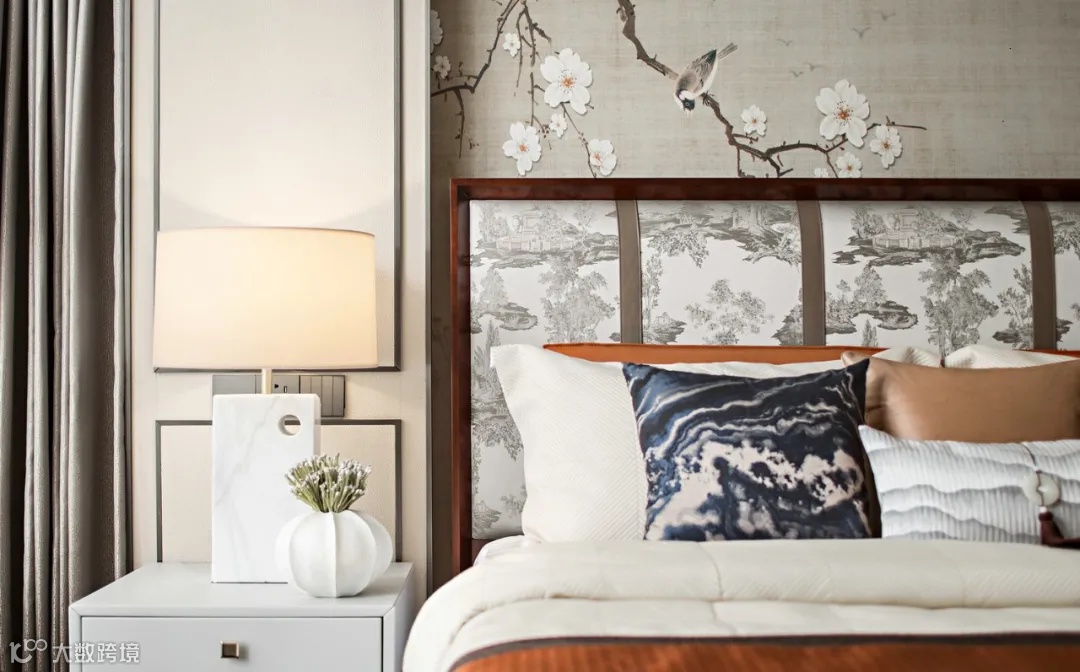 主卧工整古朴,典雅幽静床头取景古韵花鸟图,源源不断的艺术气息,烘托出空间清透优雅的气蕴。
