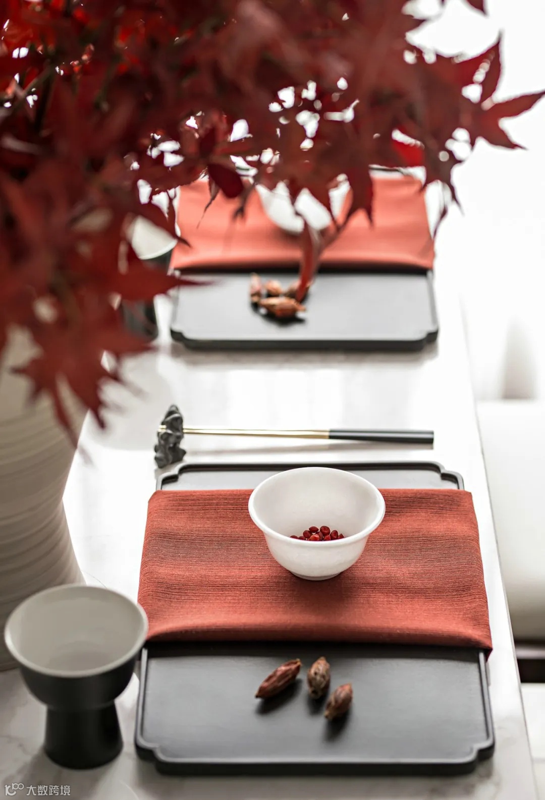将林间山水搬上餐桌,诗情画意间碰撞出生活的高贵感,枫叶红点缀古朴的中式意境,更添一丝温婉气质。