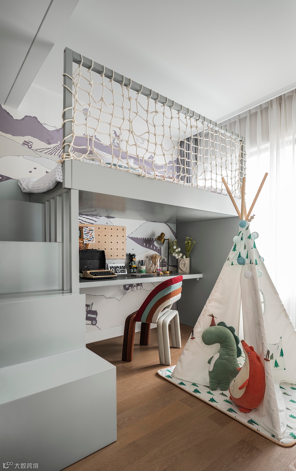 灰蓝色系上下床搭配随性的白色网状床沿护栏