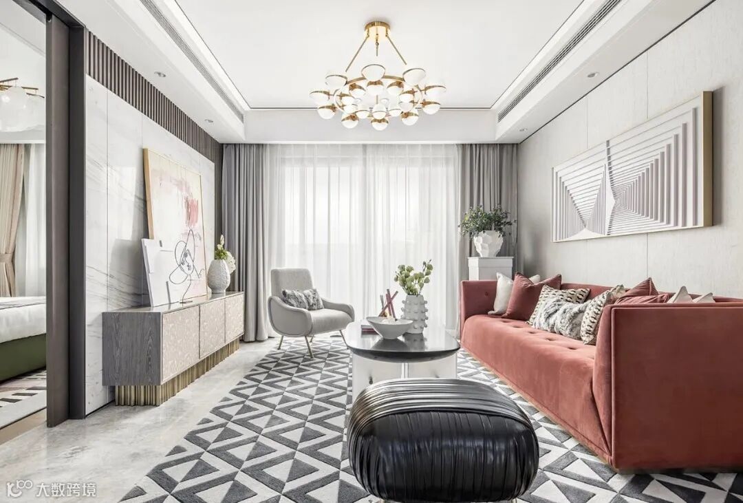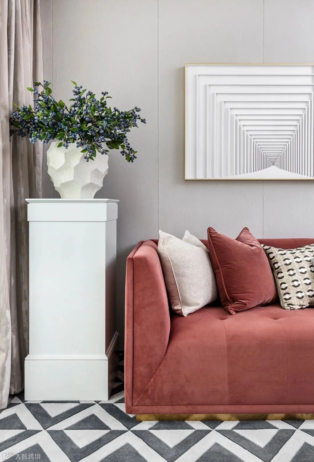 珊瑚红沙发在经典优雅的廓形中注入了跳跃的色彩,仿佛诉说着空间独一无二的个性。茶几、单人沙发、地毯等单品以黑白灰色诠释,不仅衬托出沙发的大面积跳色,也完美地将空间的优雅气质烘托而出。